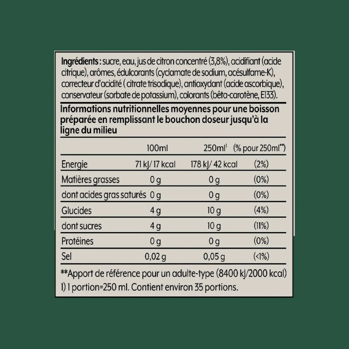 | Dosage | 1 bouchon doseur = 1 bouteille de soda. Le meilleur dosage reste le vôtre. A titre indicatif le bouchon présente 3 traits à l’intérieur (le 1er trait pour 1 verre, le 2ème pour 0,5 l et le troisième pour 1 l | |