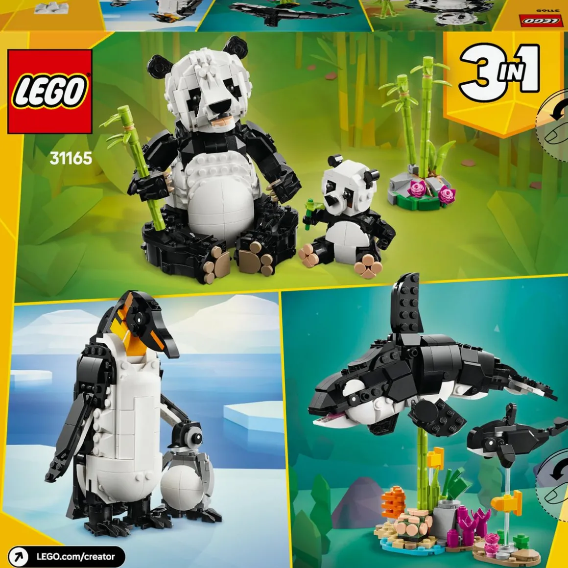 Les enfants peuvent construire 3 familles d’animaux LEGO® articulés avec les mêmes briques : un panda avec son bébé à côté de pousses de bambou, une orque et son petit pouvant être exposés ensemble sur des supports transparents ou un manchot et son poussin sur une plaque de glace et d’eau. Les 3 scènes sont parfaites pour s’amuser et décorer une chambre.