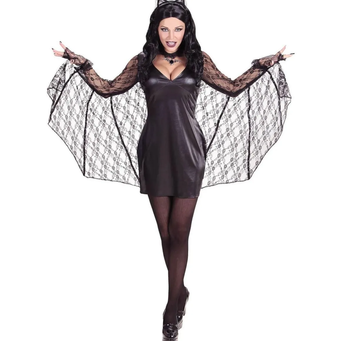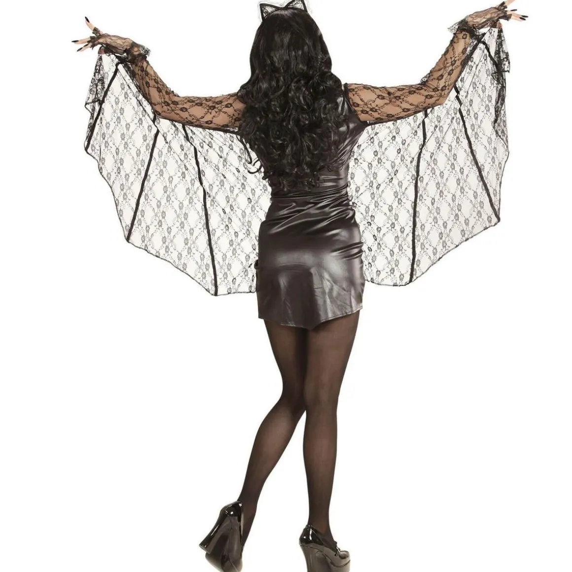 L – 40/42 – Contenu : 1 robe avec des ailes, 1 serre-tête avec des oreilles. Ce déguisement se compose d’une robe courte noire effet simili cuir. La robe possède des manches longues en dentelle. Les ailes sont en dentelle et sont reliées de la manche à la robe. En bougeant les bras vous ferez également bouger les ailes. La robe possède un décolleté en v ample. Un serre-tête avec des oreilles en dentelle noire est inclus avec le déguisement. Age minimum : la naissance