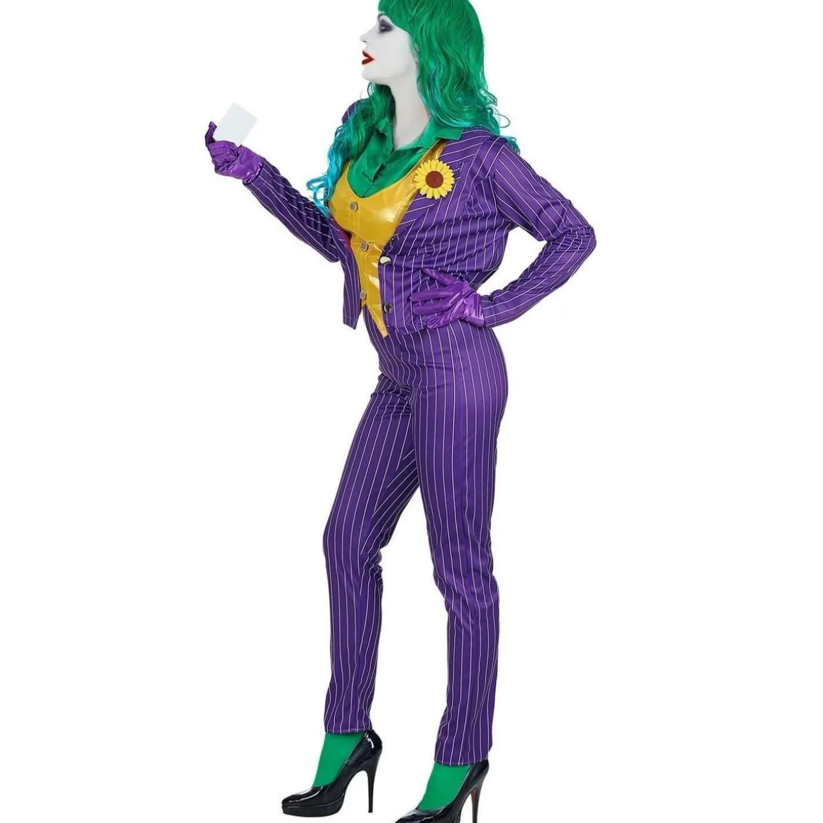 M – 38/40 – Contenu : 1 veste avec chemise et gilet, 1 pantalon, 1 paire de gants.Ce déguisement se compose d’un haut avec chemise, gilet et veste intégrée. La chemise est vert satiné. Le gilet est jaune avec 3 boutons ronds au milieu. Le col rond du gilet laisse apparaitre la chemise. La veste par-dessus est ouverte. Elle est violette avec de fines rayures blanches. Elle possède deux boutons ronds. Une fleur de tournesol est attachée sur le devant à gauche de la veste. Le pantalon est de la même couleur que la veste. Une paire de gants est également incluse. Elle est violette satiné. Age minimum : la naissance