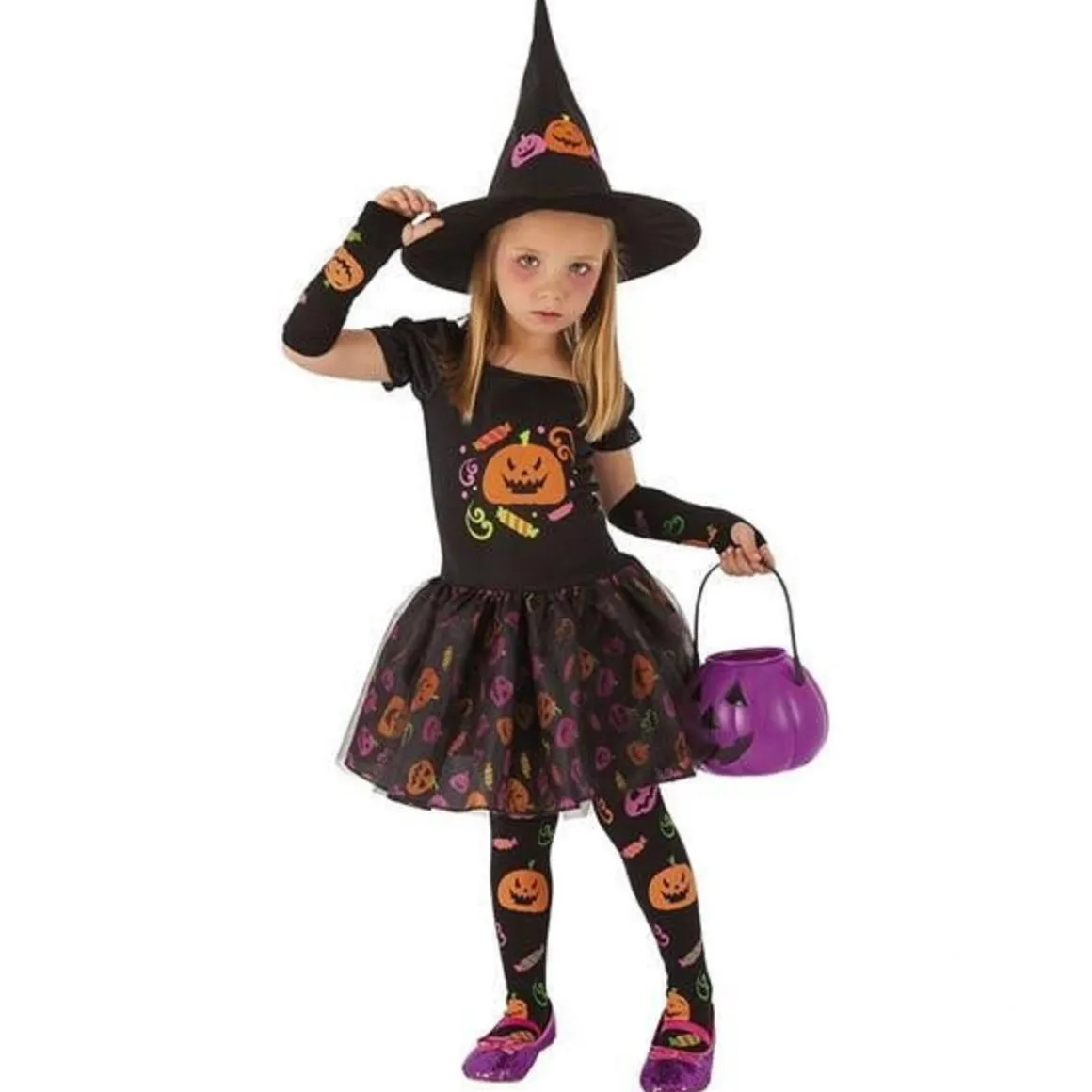 Déguisement sorcière citrouille taille L comprenant une robe, des collants, des couvre-bras et un chapeau.