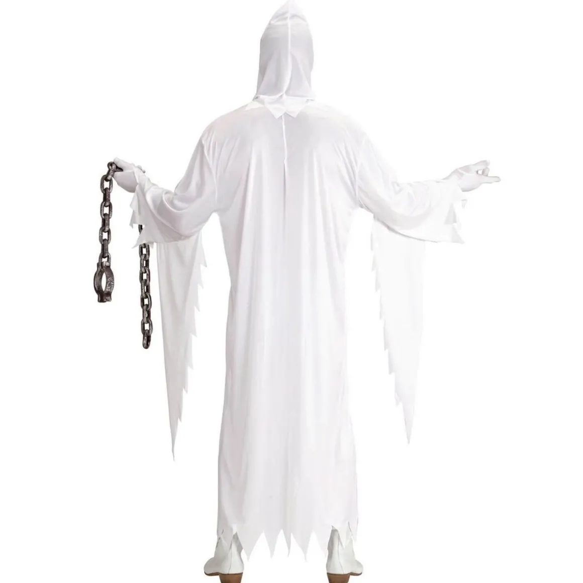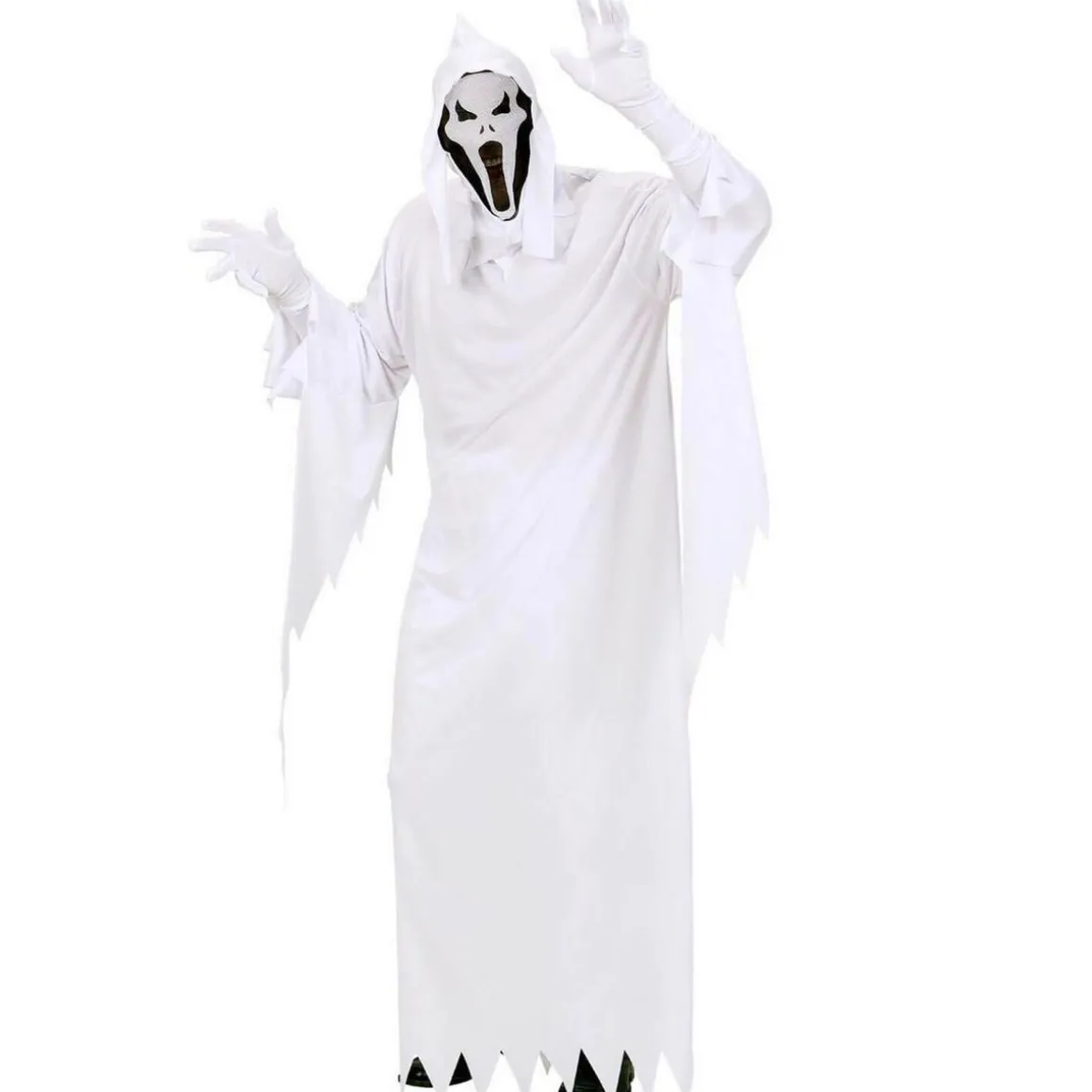M – Contenu : 1 tunique, 1 masque avec capuche.Ce déguisement se compose d’une longue tunique blanche à manches longues. Il y a des effets de déchirures sur le bas de la tunique et le bas des manches. Le déguisement vient avec un masque avec capuche qui s’enfile comme une cagoule. Le masque est noir avec un visage de fantôme blanc ouvrant la bouche comme s’il hurlait. Age minimum : la naissance