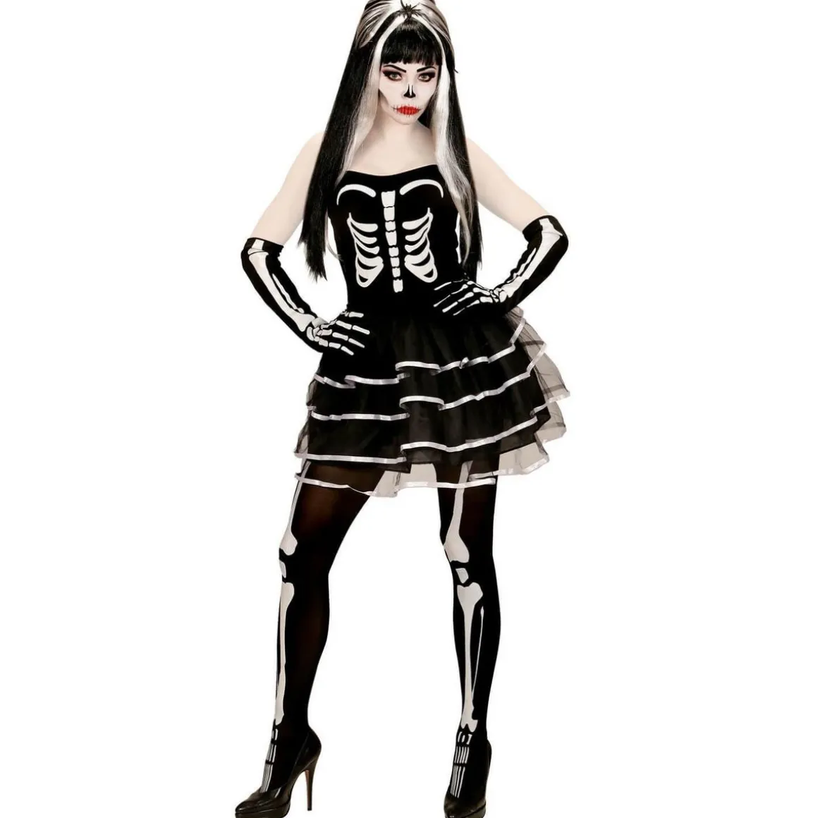 XS – 34/36 – Contenu : 1 robe et 1 paire de gants.Ce déguisement se compose d’une robe noire à bretelles. Il y a un dessin de squelette blanc sur le buste. Le jupon est noir avec plusieurs niveaux de volants. Il y a une fine bande blanche sur le bas de chaque volant. La robe est courte. Elle vient avec une paire de gants. Les gants sont noirs avec un dessin de squelette blanc qui reprend les os du bras et de la main. Age minimum : la naissance