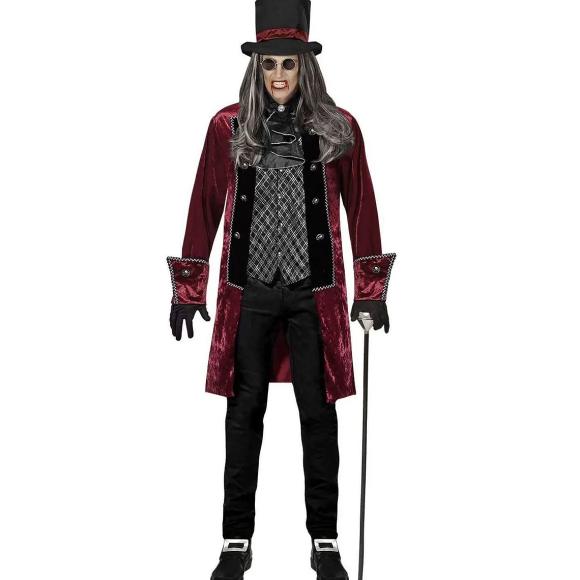 L – Contenu : 1 veste avec chemise, jabot, gants, chapeau.Ce déguisement se compose d’une veste avec chemise rouge/bordeaux. La veste est longue est à un effet velours. Elle a des détails de surpiqûres et des boutons au niveau des manches et du buste. La chemise en-dessous est noire et argent avec des carreaux. La veste vient avec un jabot noir qui possède un liseré argenté et un bouton similaire à ceux présents sur la veste. Pour compléter le look une paire de gants noire ainsi qu’un chapeau haut de forme noir avec une bande rouge/bordeaux sont inclus. Age minimum : la naissance
