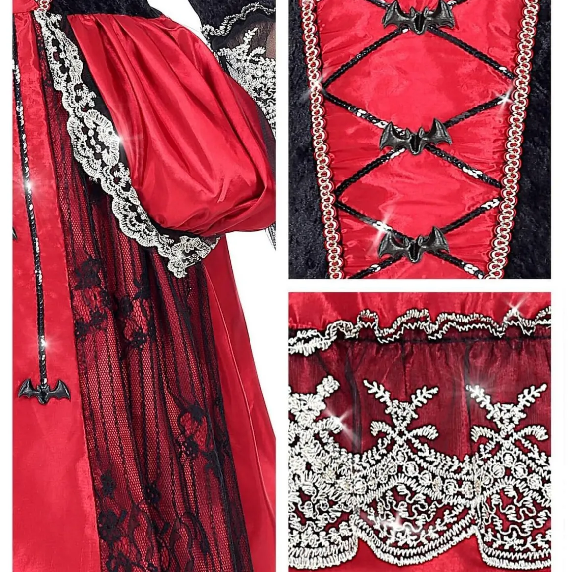8/10 ans (128 à 140 cm) – Contenu : 1 robe, 1 collier.Ce déguisement se compose d’une robe avec jupon en crinoline. Ce jupon donne un effet bouffant à la robe. Le jupon de la robe est rouge satiné avec des détails de broderies noir et argent sur le bas. Il y a également un effet d’araignées qui descendent de leur toile avec des sequins noirs. Il y a un jupon supplémentaire par-dessus en dentelle noire. Le bustier est noir à manches longues évasées effet velours. Il y a un corsage rouge avec des lacets noirs en sequins et des détails avec des araignées. La robe possède un grand col noir avec l’intérieur rouge. Un collier tour de cou noir avec une pierre effet rubis est inclus dans le set. Age minimum : la naissance