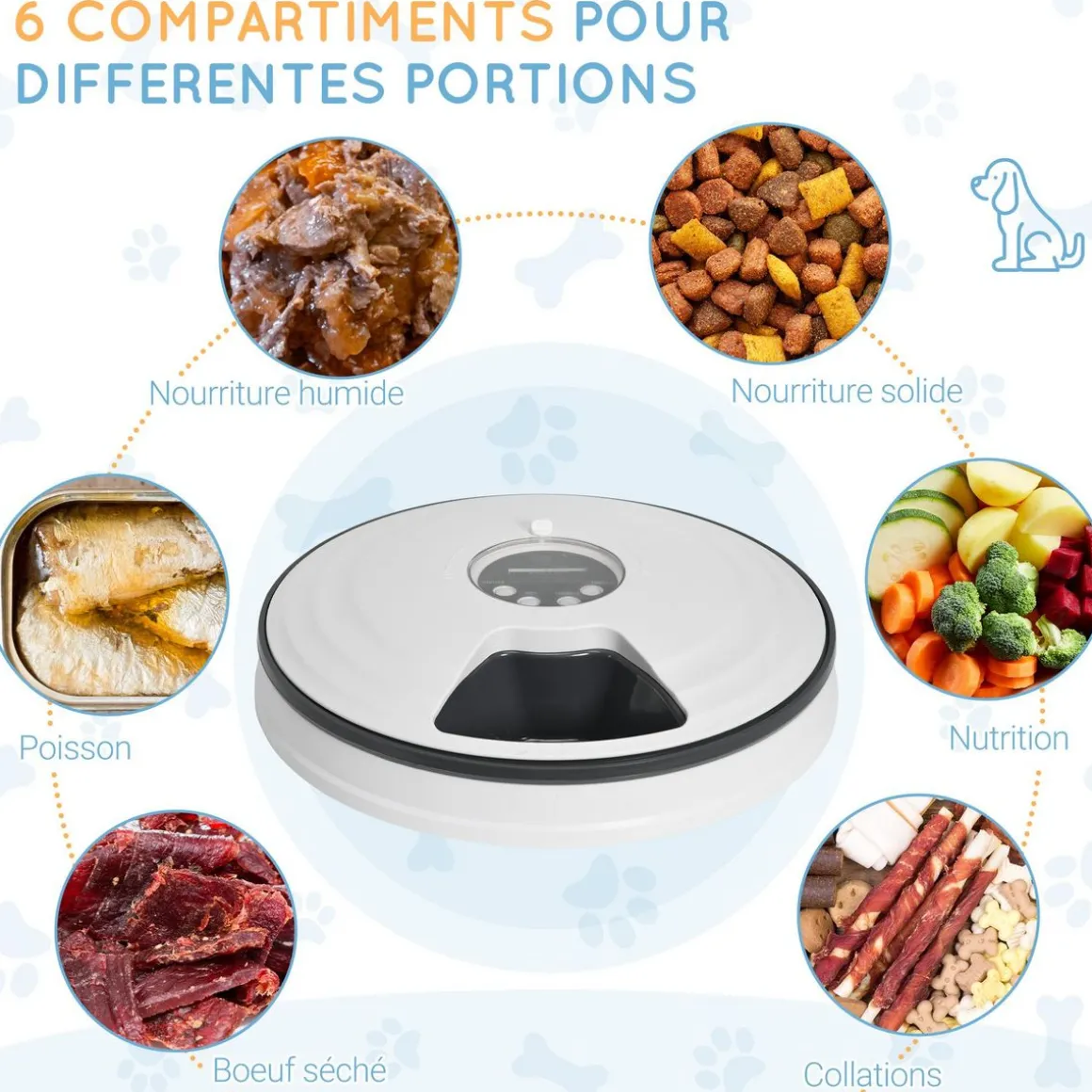 – 6 compartiments amovibles, chacun d’une capacité de 128 ml, idéal pour varier l’alimentation de votre animal et vous faciliter l’entretien