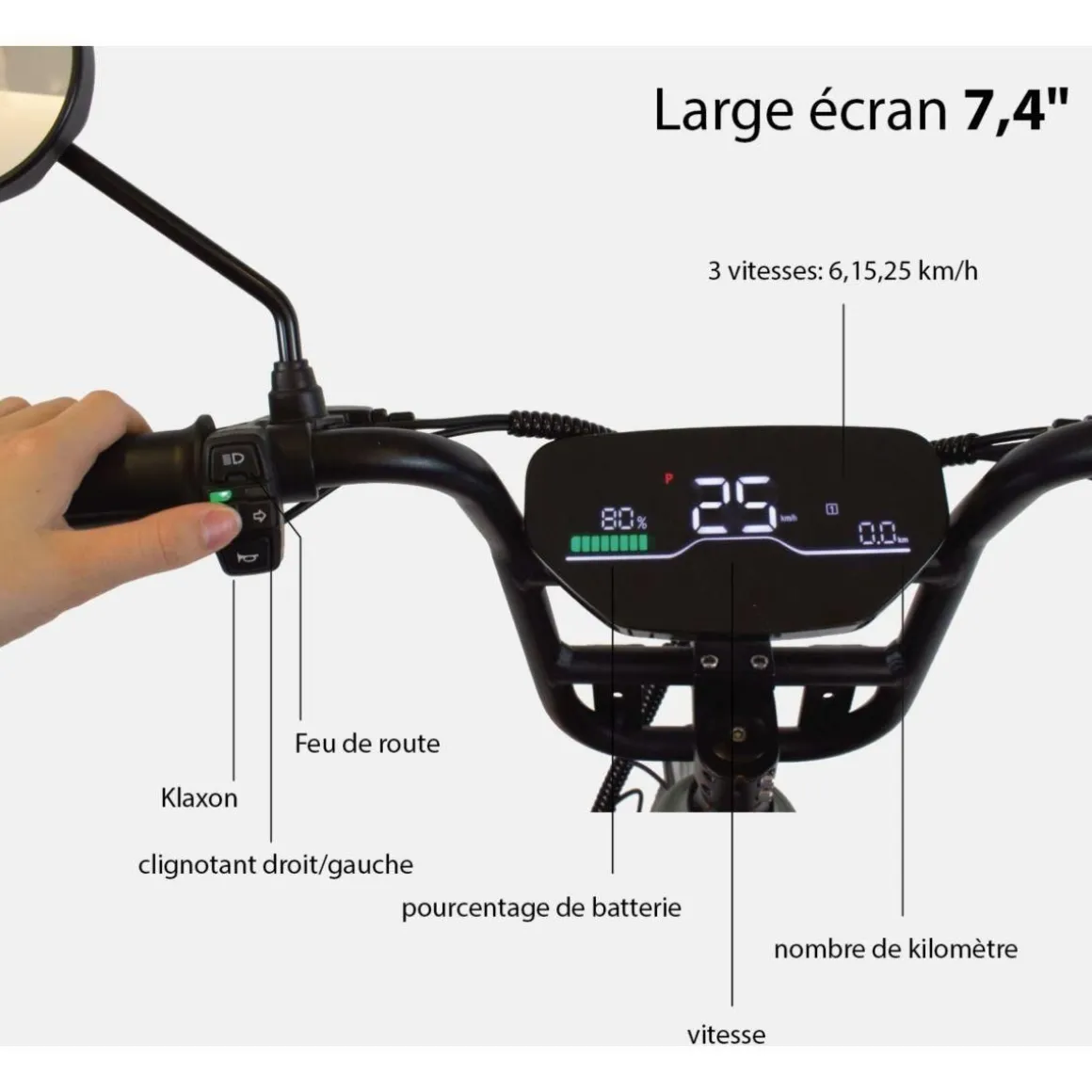 | Ecran d’affichage | Oui, permet de visionner des informations relatives à la conduite (autonomie batterie, distance parcourue, mode de vitesse, etc.) | |