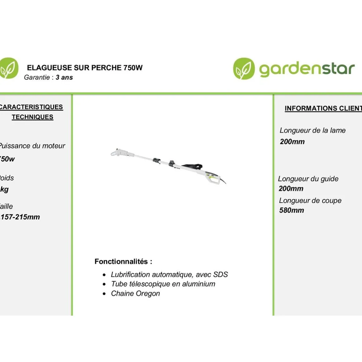 L’élagueuse sur perche électrique Gardenstar de 750W est un outil performant pour l’élagage des branches hautes et difficiles à atteindre. Dotée d’une puissance électrique de 750W, elle offre une grande efficacité pour couper les branches épaisses avec précision. Grâce à sa perche télescopique ajustable, cette élagueuse vous permet d’atteindre facilement les endroits les plus élevés sans utiliser d’échelle, offrant ainsi une portée supplémentaire pour un élagage en toute sécurité. Cela rend l’outil idéal pour tailler les branches élevées ou inaccessibles, offrant également un confort et une maniabilité pendant l’utilisation. Son système de coupe performant et sécurisé permet de réaliser des coupes précises et nettes sur les branches épaisses, assurant ainsi un travail soigné et efficace. L’élagueuse sur perche électrique Gardenstar est un outil pratique pour l’entretien des arbres et des haies dans votre jardin ou votre espace vert.