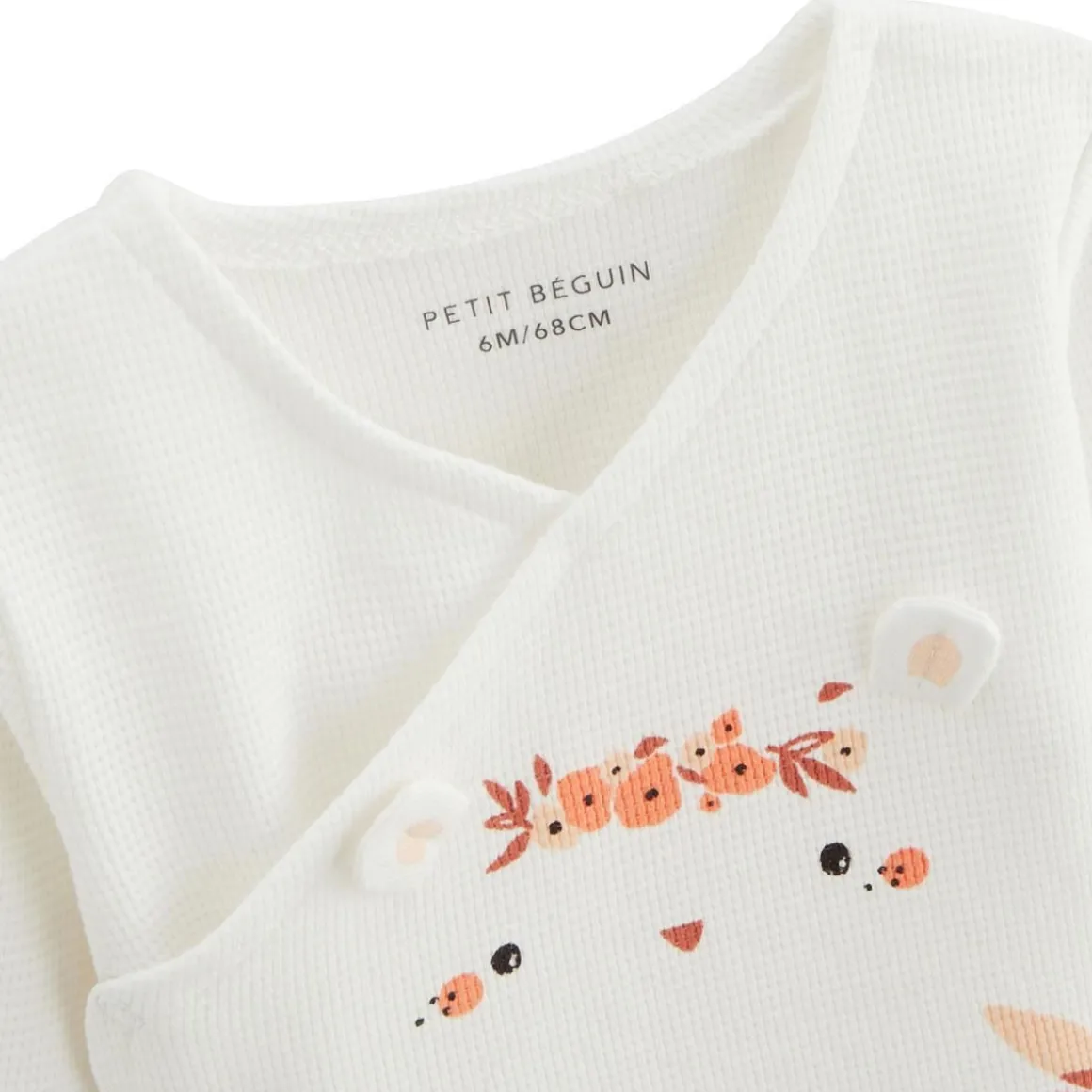 Un ensemble conçu pour les tout-petits bouts : un gilet avec son ouverture croisée et son petit pantalon avec ses jolis petons intégrés. Il est le cadeau parfait à offrir ou à ajouter à son trousseau de naissance. On craque pour sa couleur pêche et ses jolis motifs craquants. Produit labellisé STANDARD 100 by OEKO-TEX ® (BJ020 189402 TESTEX) En coton matelassé tout doux et moelleux ! On craque pour le visage et les petits petons intégrés