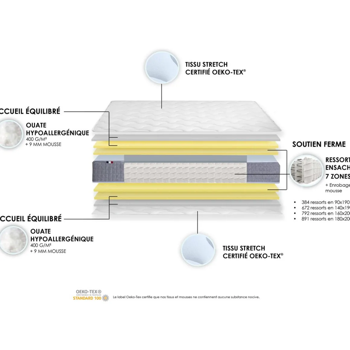 Point fort 4 : Fabrication Française – Certfié ISO 9001 – Usine eco-responsable : 98% des déchets recyclés – Tissus & mousse Certifiés OEKOTEX 100 -Bois sommier certifié PEFC – Garantie : Matelas 5 ans