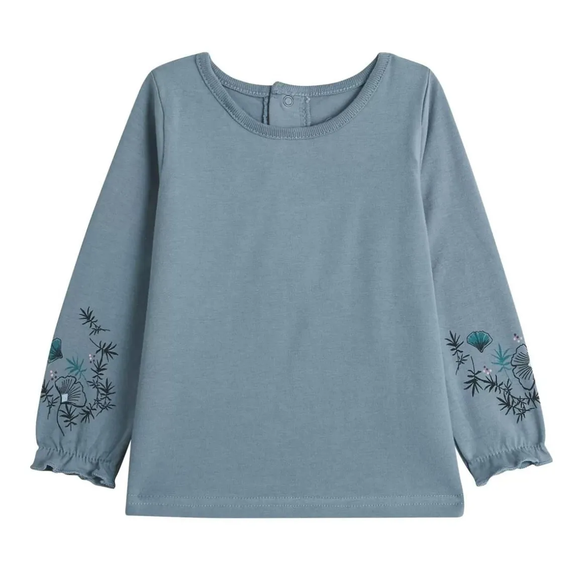 La recette d’un look réussi : une combinaison pantalon rouge cerise tendance et confort, avec de jolis volants aux bretelles bien sûr ! Pour parfaire le look, découvrez ce joli t-shirt à manches longues de couleur bleu gris, avec de beaux motifs poétiques sur les manches. Les jolies bretelles à volants Les finitions du t-shirt