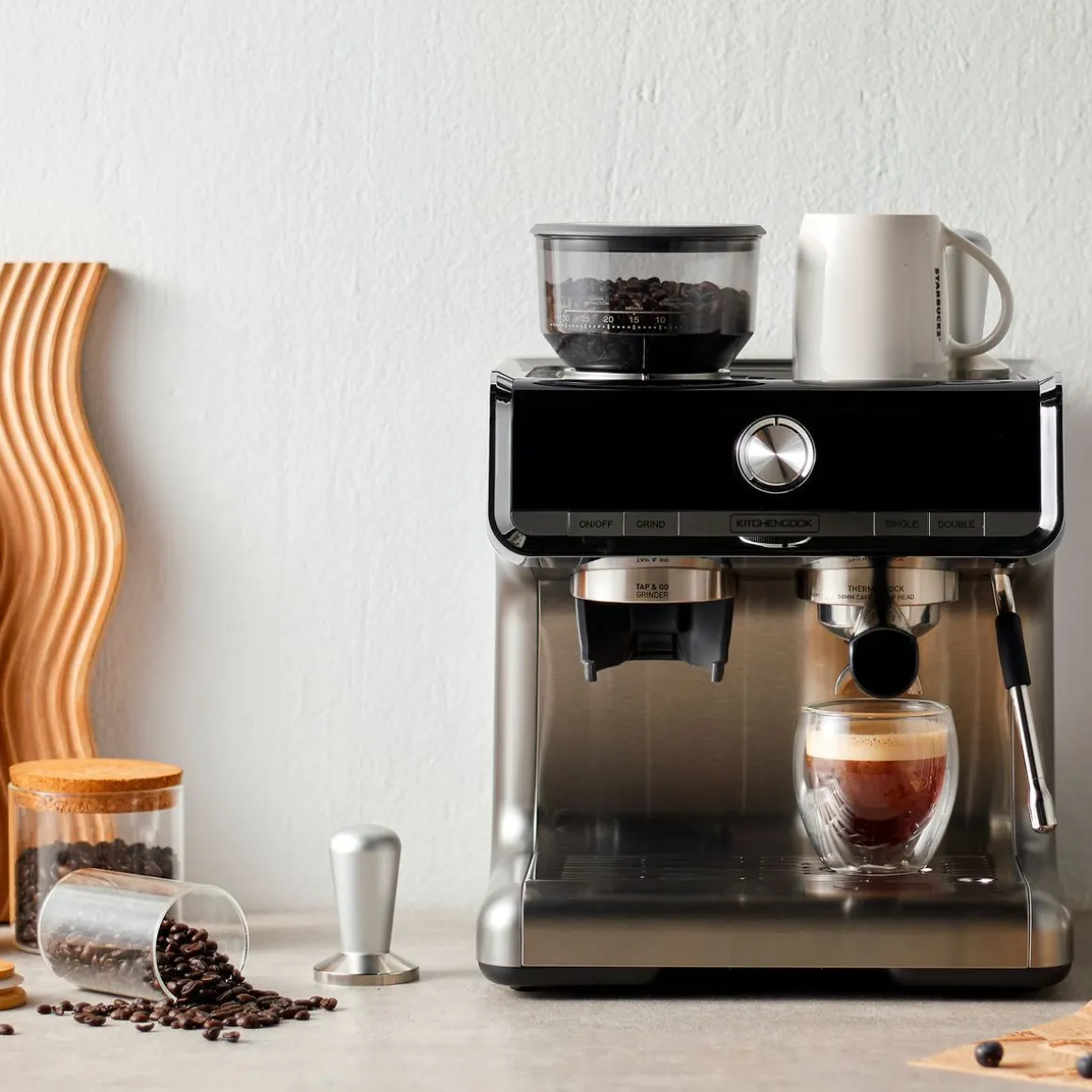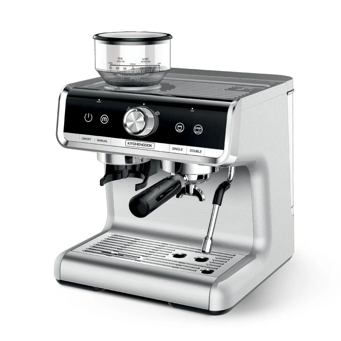 KITCHENCOOK Expresso broyeur HOME BISTROTDotée d’une puissance de 1500W, la machine à expresso broyeur HOME BISTRO de Kitchencook vous permet de préparer toutes les sortes de cafés : cappuccino, latte macchiato, Espresso, lungo, ristretto et mousse de lait, il y en a pour tous les goûts !Vivez une expérience de goût unique grâce à la trémie amovible à grains possédant 30 réglages de broyage et à la buse vapeur vous permettant de réaliser de somptueux latte art pour un aspect inégalable et personnalisable. Programmée avec un système semi-automatique, la machine à café HOME BISTRO de Kitchencook s’occupe de tout : l’arrêt de la machine se fait systématiquement au bout de 20 minutes de non-utilisation de l’appareil et le détartrage de la machine est systématique.La niche a spécialement été conçu à une hauteur lui permettant de recevoir les tasses et les verres. Malgré son design sophistiqué et professionnel, la HOME BISTRO est très simple d’utilisation : vous retrouverez 4 boutons principaux vous permettant d’allumer et d’éteindre la machine, de préparer une ou deux tasses de café, de broyer le café et de nettoyer la machine.