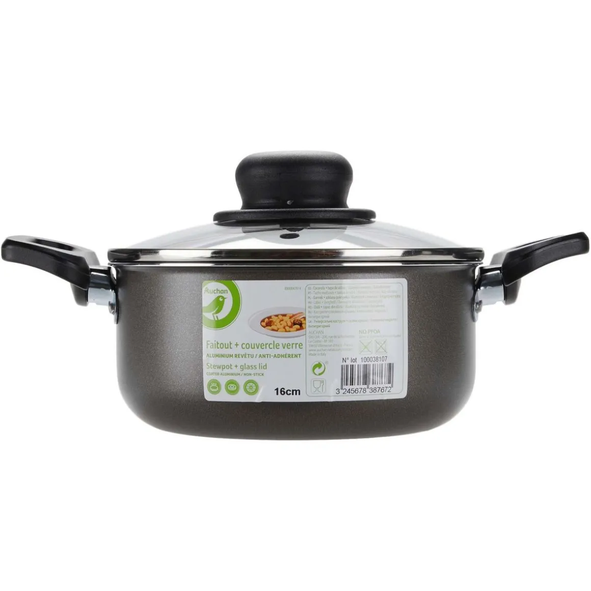Faitout aluminium 16 cm avec couvercle en verre, couleur noir. Compatible tous feux dont induction, avec revêtement antiadhésif en aluminium et 2 poignées fixes.