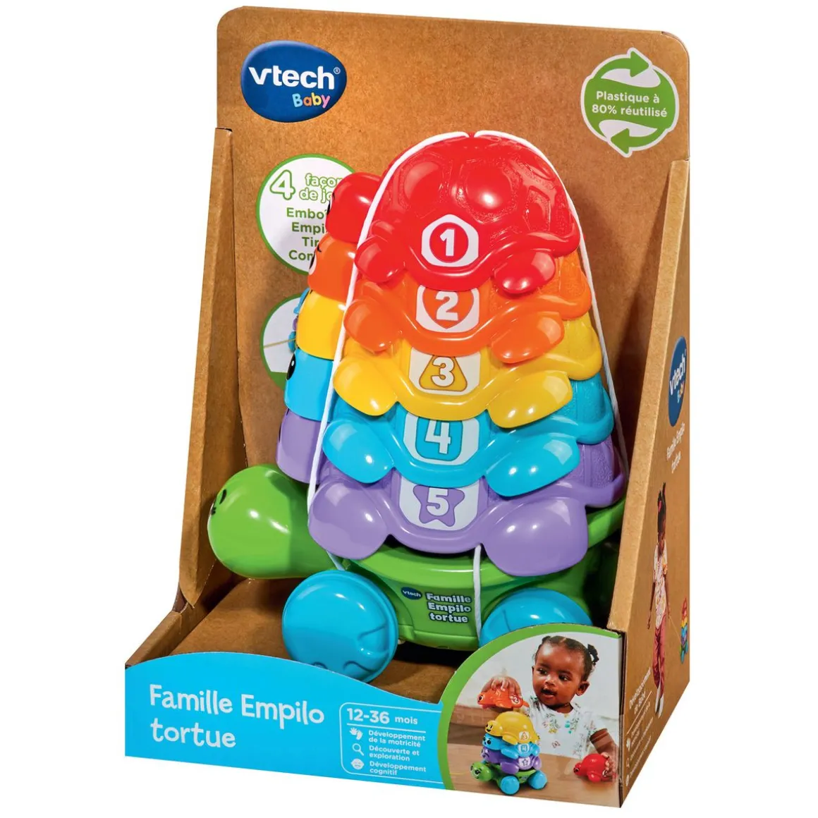 Famille empilo tortue (plastique réutilisé) – 12 – 36 mois. Des tortues à empiler ou à imbriquer sur le dos de leur maman pour développer la motricité fine de Bébé. 5 tortues de tailles et de couleurs différentes pour encourager les tout-petits à manipuler et découvrir. Sur chaque bébé tortue, on retrouve :. – Un visage exprimant une émotion pour découvrir les différentes humeurs. – Un chiffre pour apprendre à compter et résoudre une suite logique de 1 à 5. – Une couleur et un motif gravé pour stimuler la vue et le toucher de Bébé. 4 façons de jouer :. – Emboîter. – Empiler. – Tirer : une cordelette permet de transformer l’empilo en jouet à tirer et de faire rouler toute la famille tortue. – Compter. En roulant, Maman Tortue cahote et fait découvrir à votre tout-petit la notion d’équilibre en essayant de faire tenir les Bébés tortues sur son dos. Contient 80% de plastique post-industriel réutilisé. Boîte ouverte.