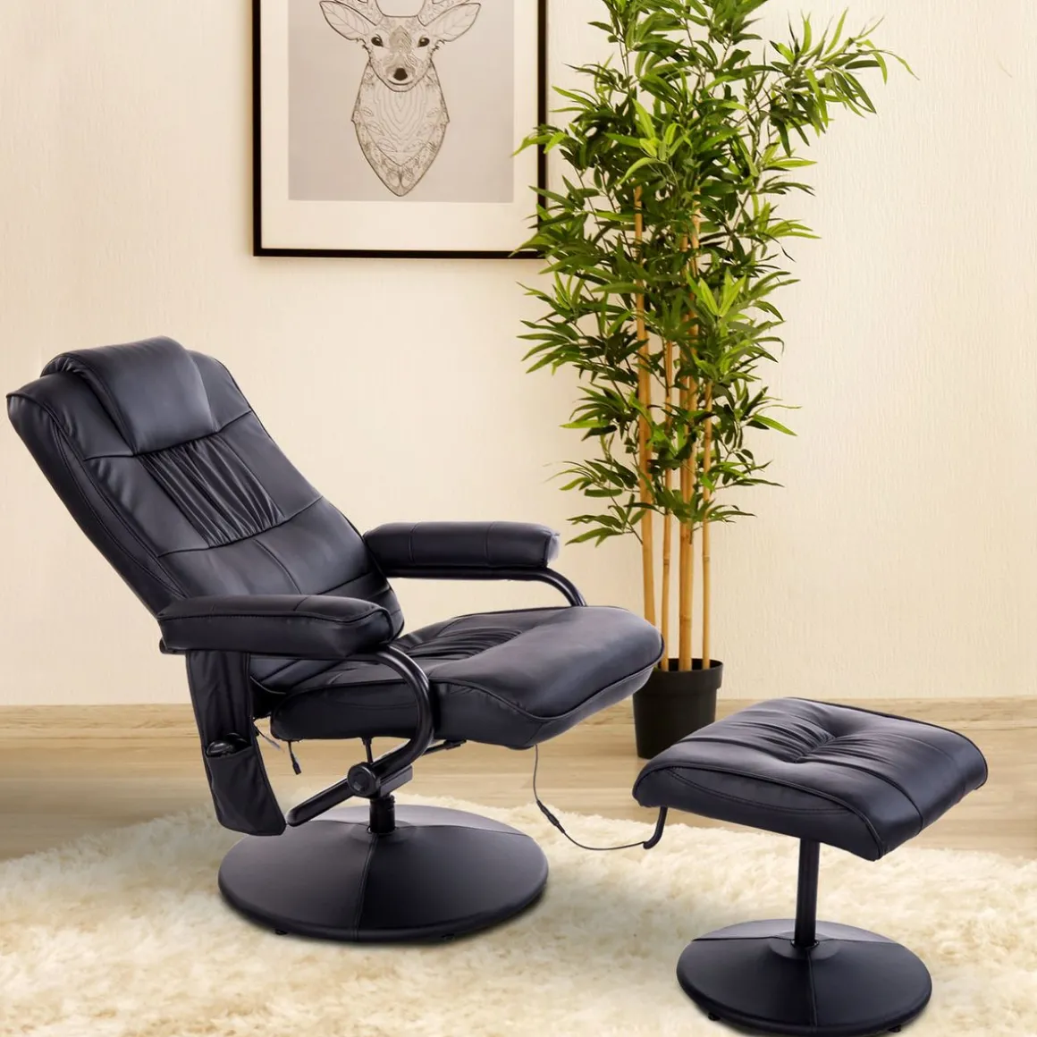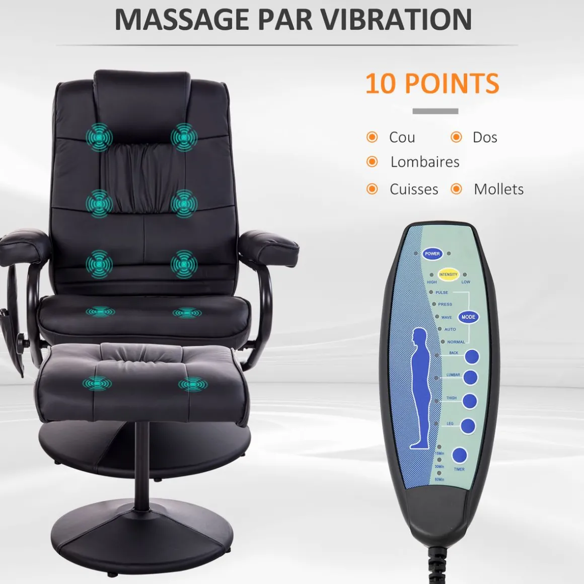 – 10 points de massage par vibration pour les muscles de la tête, de la nuque, du dos, du postérieur et des mollets (6 points dans le dossier, 2 dans l’assise et 2 dans le repose-pieds)