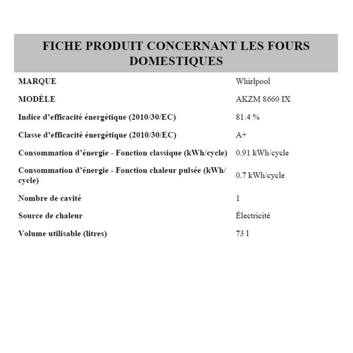 WHIRLPOOL Four encastrable AKZM8660IX Profitez de ce four Whirlpool, il est équipé de la technologie d’auto nettoyage utilisant un cycle à haute température pour réduire en cendres les résidus alimentaires, qui peuvent ensuite être plus facilement nettoyés d’un coup d’éponge. La technologie exclusive 6ème SENS permettantde choisir parmi une variété de recettes préprogrammées,tandis que votre four règle automatiquement le type, latempérature et la durée de la cuisson, pour des résultatsparfaits. La chaleur pulsée vous permet de faire cuirejusqu’à 3 plats en même temps sans risque d’en mélangerles odeurs.Il n’a jamais été aussi facile de cuisiner avec les touchesrétroéclairées à 3 niveaux d’aspiration : Frémire, Bouillir,Frire.La fonction préchauffage rapide, est un puissant système deconvection permettant d’atteindre rapidement la bonnetempérature.Grâce à ses charnières au mouvement ralenti, la porte du four se ferme sans effort, avec un mouvement doux et silencieux.Une utilisation en toute sécurité grâce au performantsystème de ventilation et d’isolation qui maintient laporte du four à une température basse en toutescirconstances et même lors d’une pyrolyse.