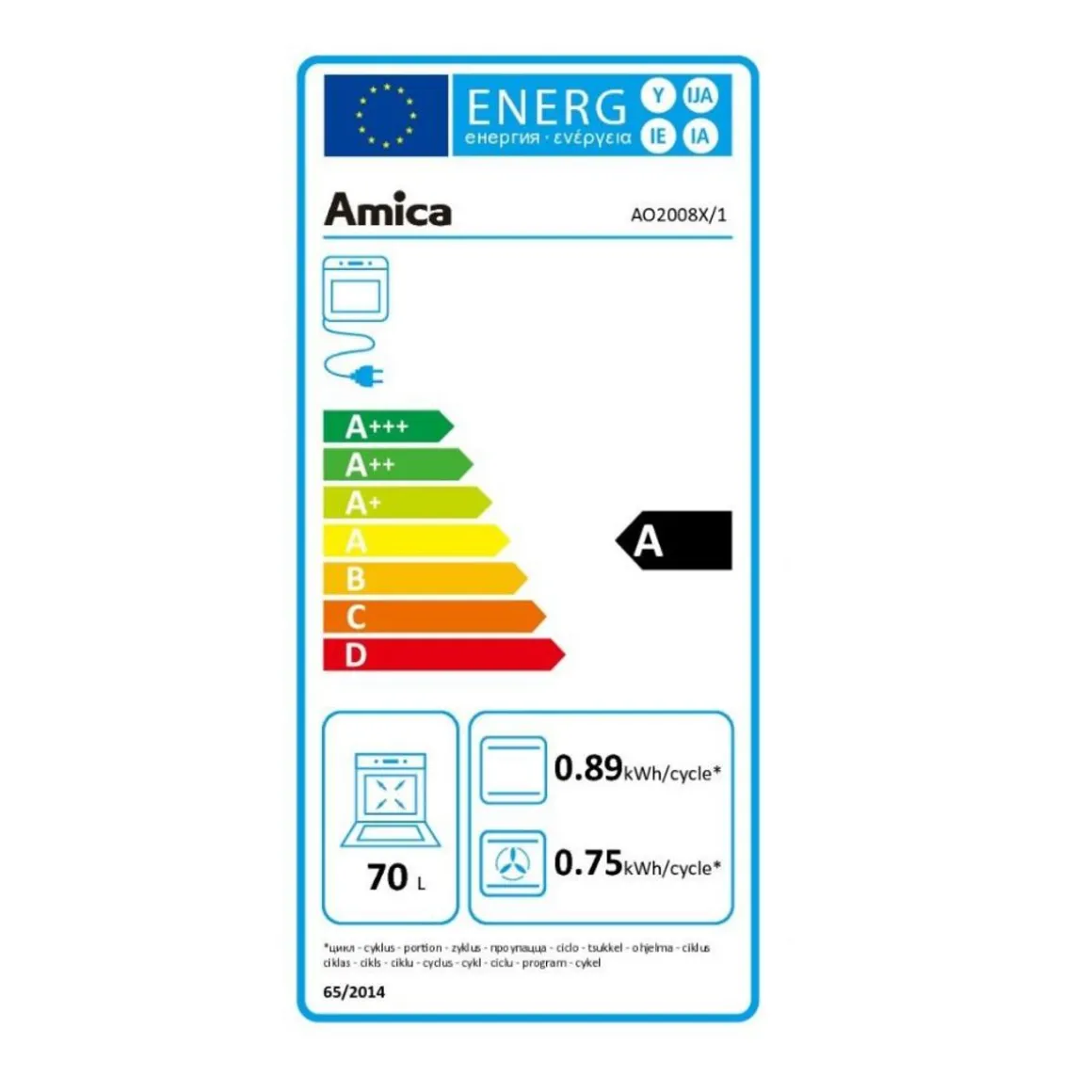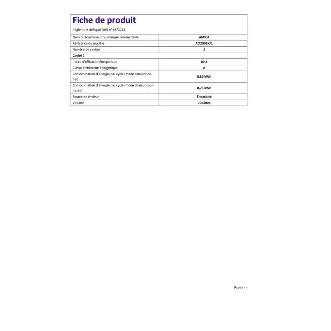 Indice d’efficacité énergétique (EEI cavité entière) : 89.3.