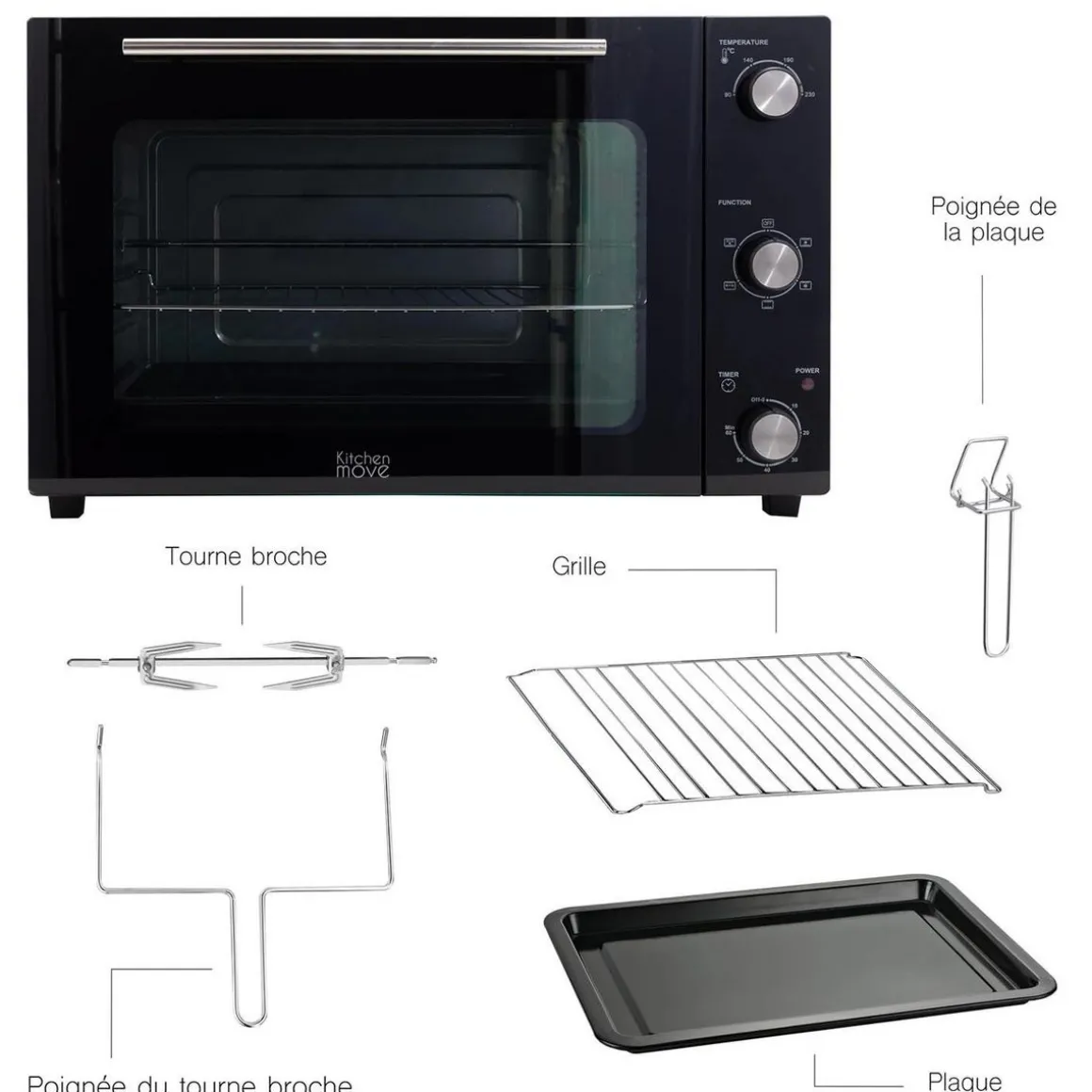 Accessoires : grille, lèchefrite, tournebroche et poignées (1 poignée pour le tournebroche et 1 poignée pour la plaque/lèchefrite)