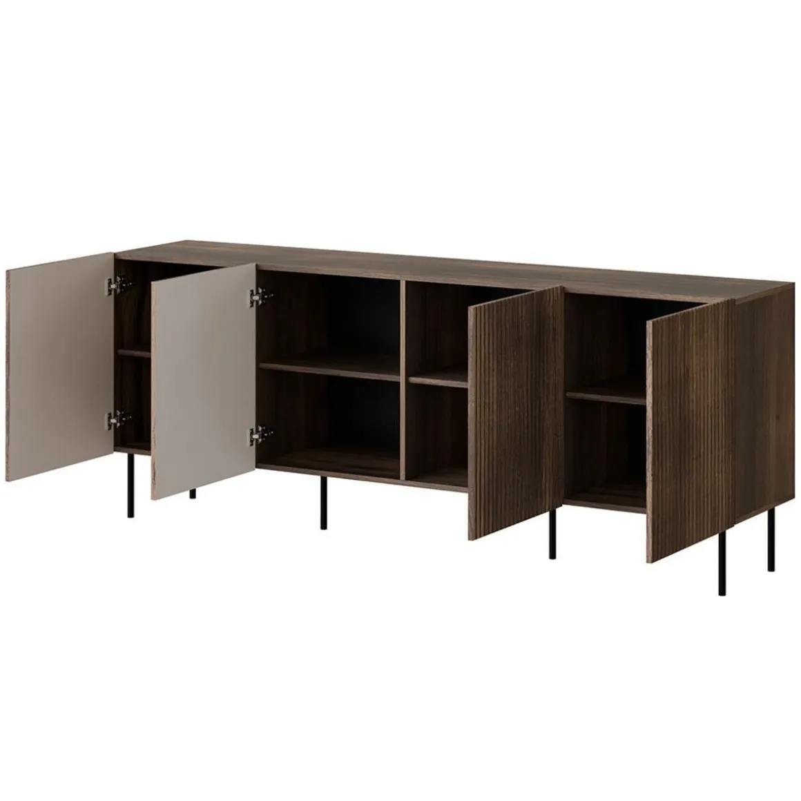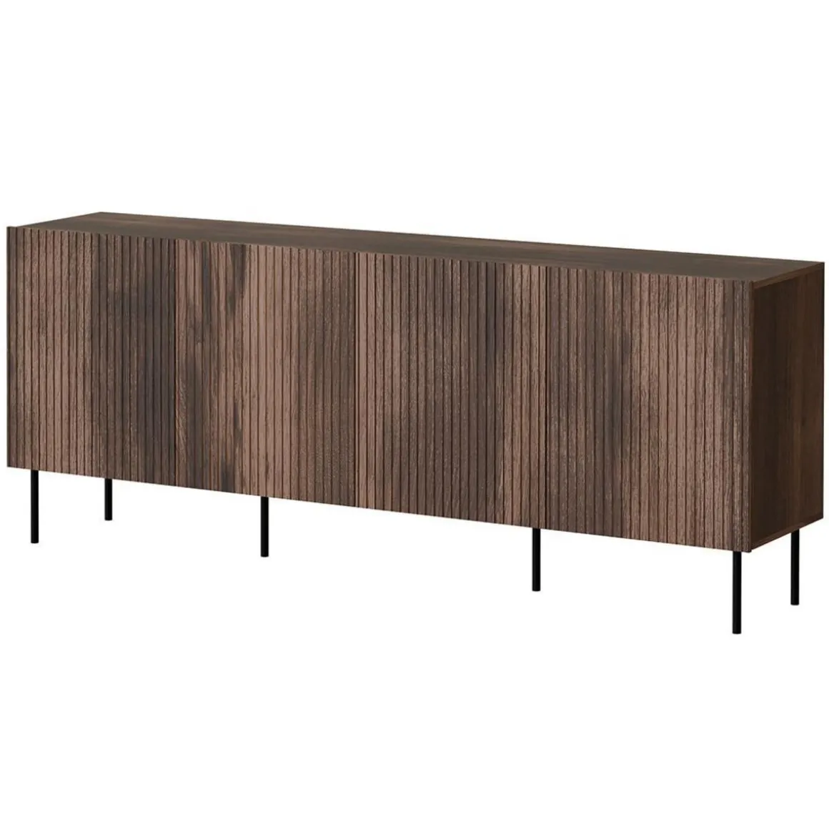 Confectionné en bois et surélevé par des pieds en métal, le modèle de buffet bas Franco vous charmera par ses finitions soignées et son allure sobre très en vogue. Vous adorerez ses multiples espaces de rangement : derrière 4 portes, vous trouverez pas moins de 8 espaces de rangement aux dimensions généreuses. Vous pourrez alors aisément y ranger vos nappes, vaisselle, décorations, mais aussi vos magazines ou tout autre objet personnel de votre choix. La surface lignée de ce joli buffet est parfaite pour créer un joli contraste ainsi qu’un bel effet de volumes, tout en conservant une simplicité très esthétique. De quoi parer votre espace séjour d’un atout de charme incomparable, et apporter une touche de chaleur dans votre pièce à vivre.