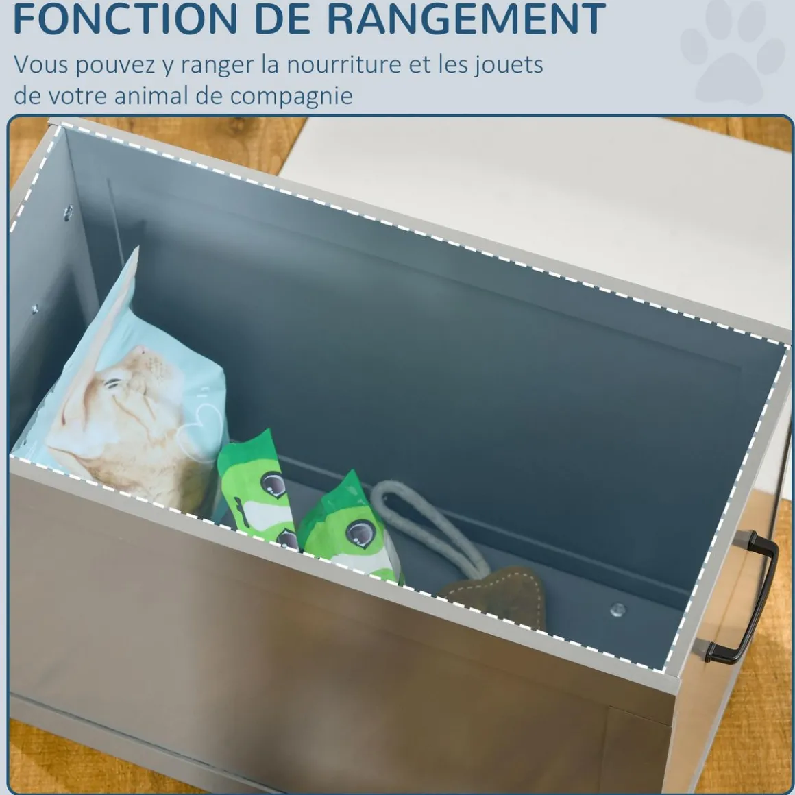 – Coffre interne de rangement, pratique pour y mettre des accessoires ou jouets de votre animal