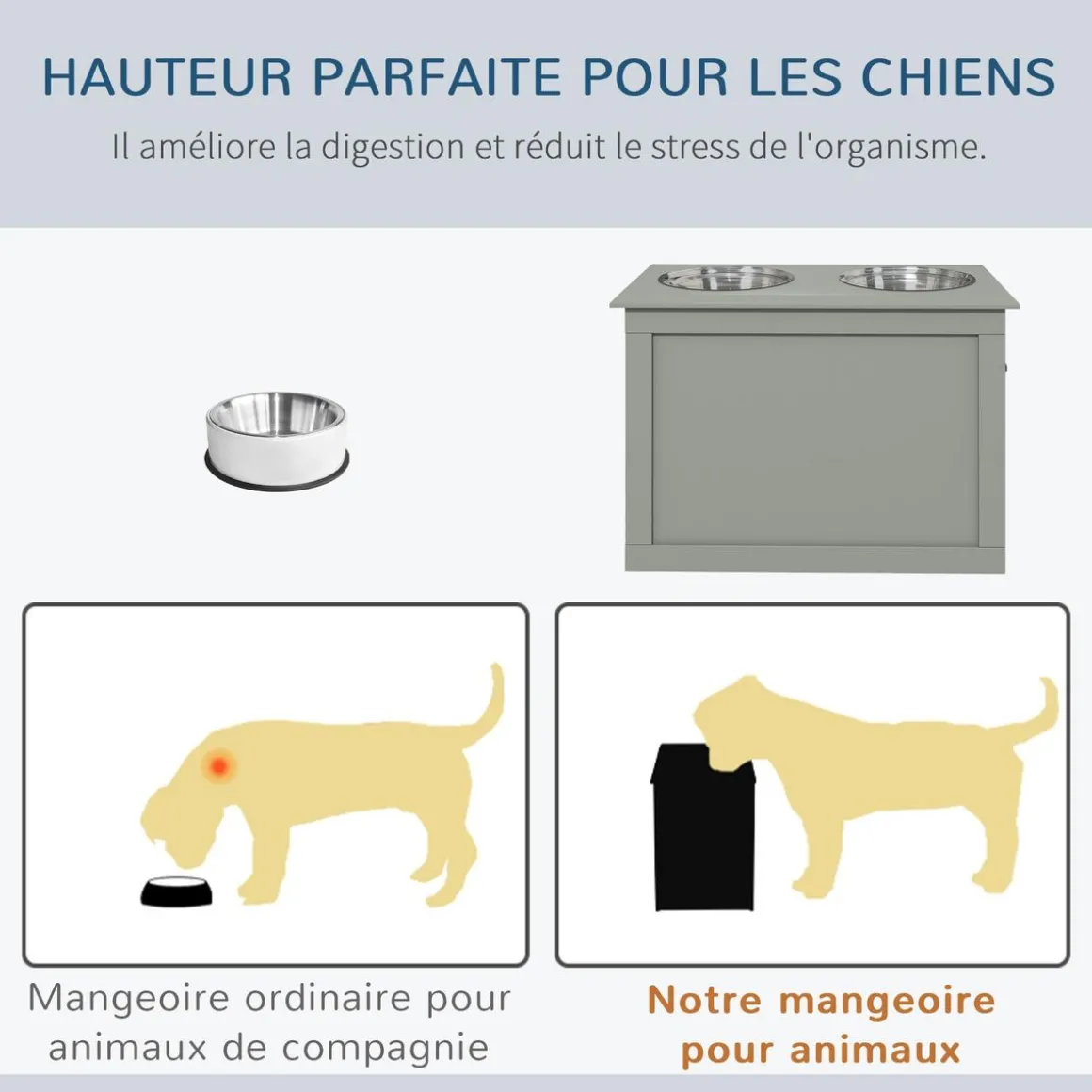 – Porte-gamelles surélevé idéal pour améliorer le confort et bien-être de votre chien lorsqu’il s’alimente ou boit