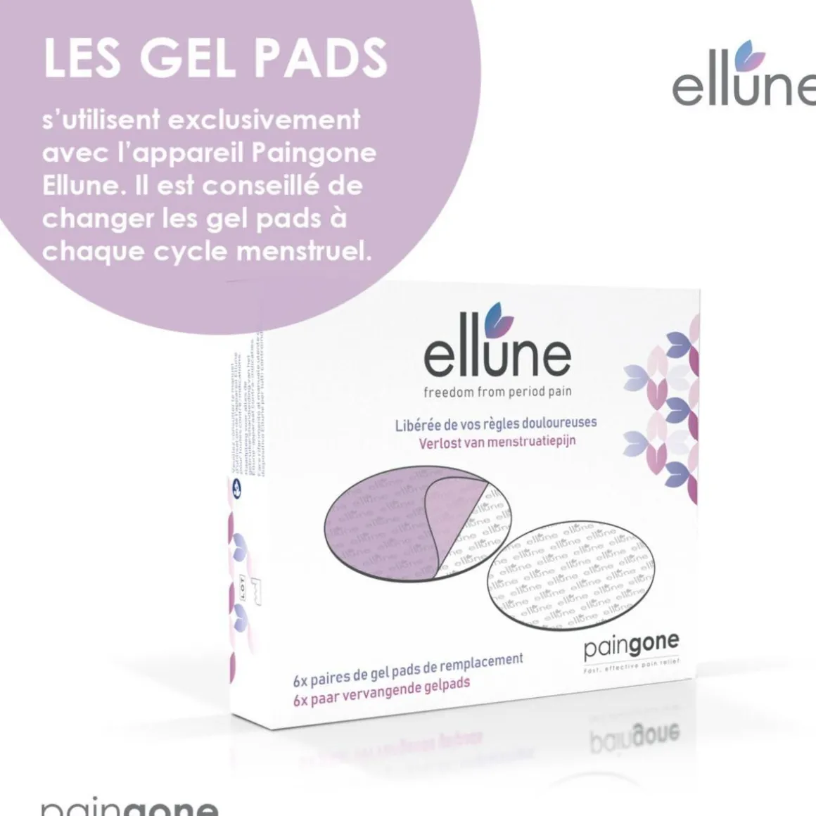 | Particularité | 6 Paires de gel pads, utilisables exclusivement avec l’appareil Paingone Ellune. Il est conseillé de changer les 2 gel pads à chaque cycle menstruel. | |