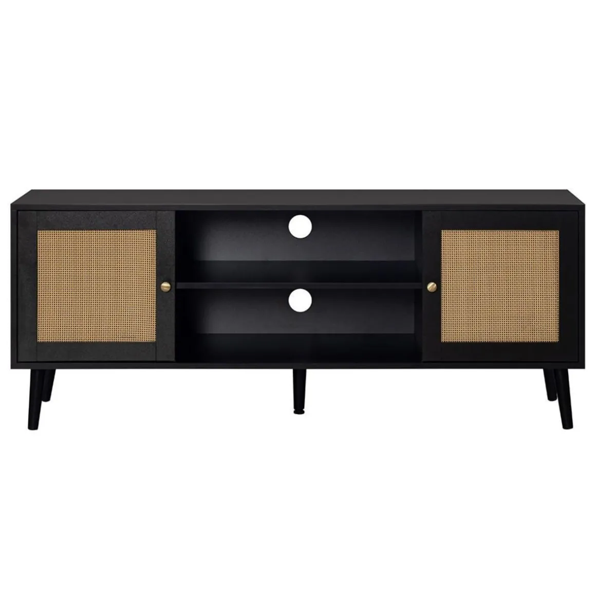 Le meuble TV Goto noir de 140 cm est l’alliance parfaite entre design vintage et modernité. Sa façade en cannage, à la fois tendance et élégante, apporte une touche de naturel dans votre salon. Les poignées dorées, finement travaillées, accentuent le charme sophistiqué de ce meuble. En plus de sa belle allure, il est conçu pour devenir l’élément central de votre espace télé. Il s’intègre harmonieusement dans tous types de décoration intérieure, qu’elle soit contemporaine ou plus altique.