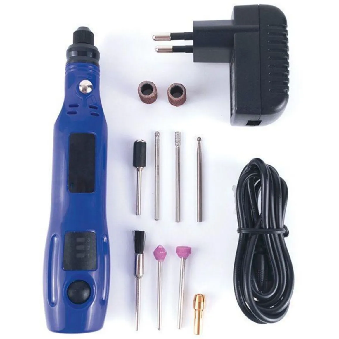Pratique, léger, ergonomique et pratique, ce graveur sur verre sans fil vous permettra de réaliser facilement de jolies gravures sur tous types d’objets en verre. Grâce à ses vitesses variables et ses 10 accessoires pour graver, affûter et fraiser le verre, ce graveur électrique offre de multiples possibilités de personnalisation ainsi qu’un travail de grande précision. Graveur sur verre électrique sans fil, 3 vitesses. 10 embouts (fraises diamantées, meules…). Vendu sous blister