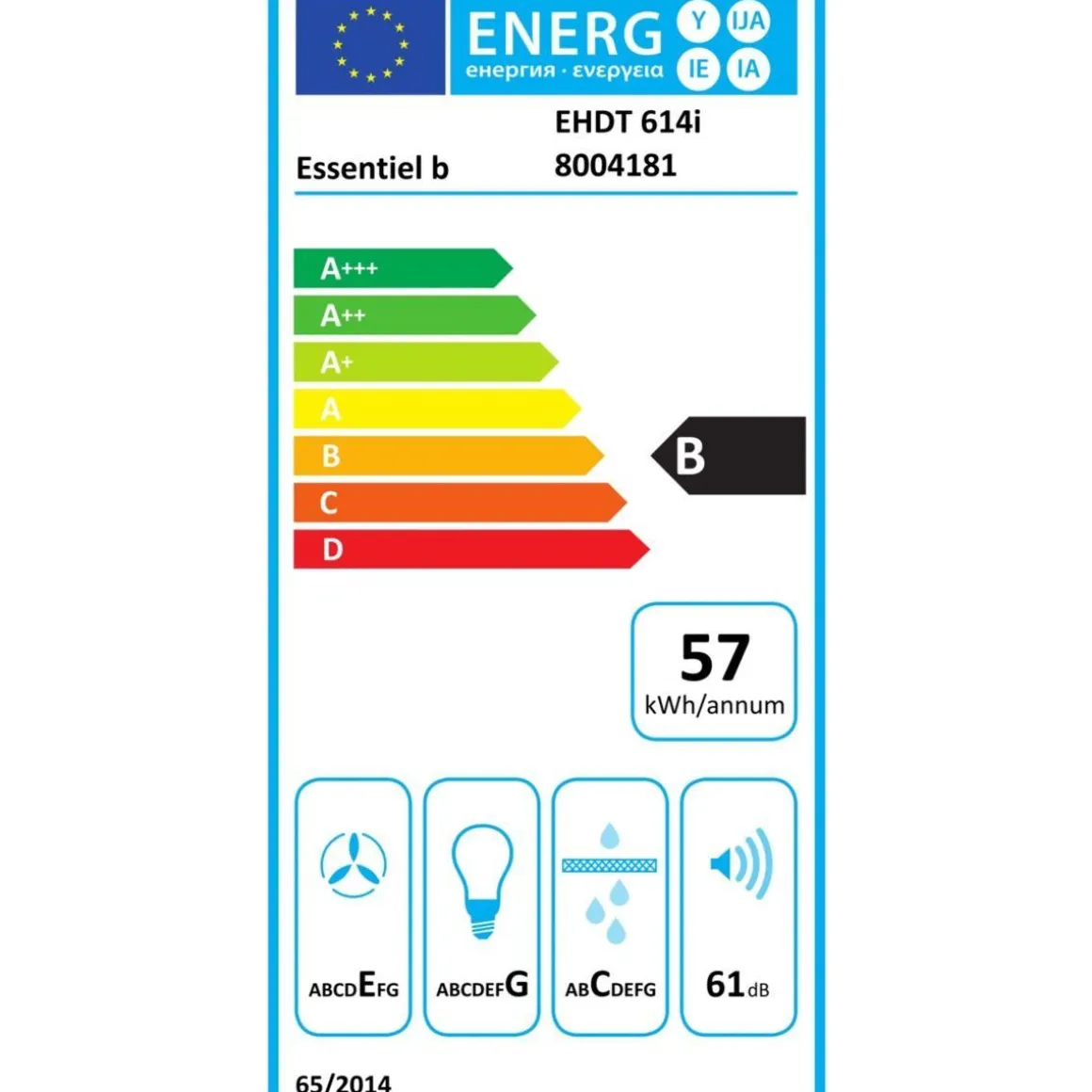 | Consommation d’énergie | Classe d’efficacité énergétique: B, Consommation annuelle d’énergie en kWh: 57 kWh, Classe d’efficacité d’évacuation de la vapeur et fumées: E, Classe d’efficacité de l’éclairage: G, Classe d’efficacité de filtration des graisses: C | |