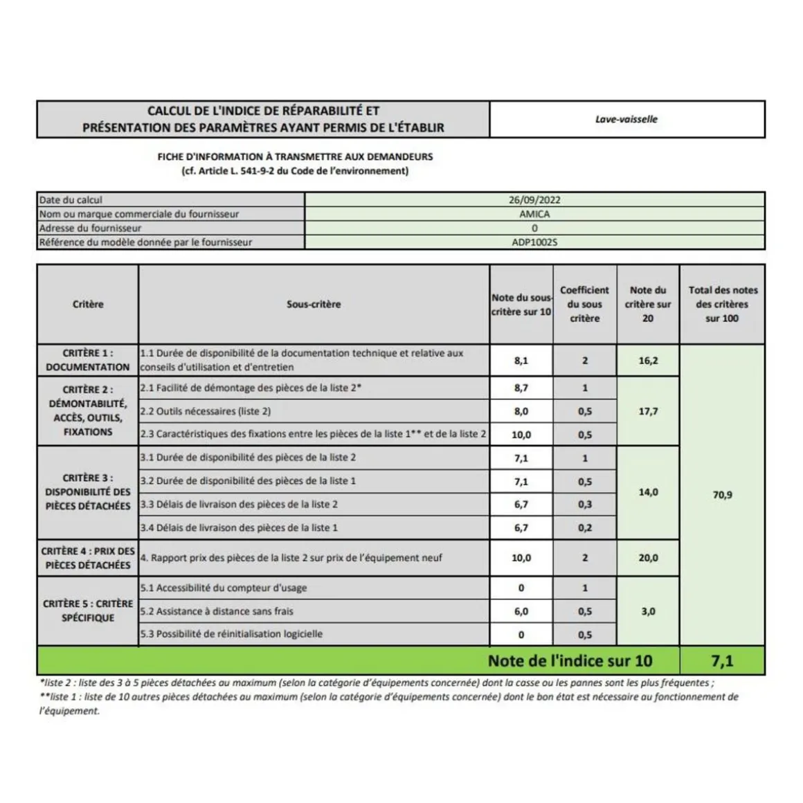 Conso. d’énergie pour 100 cycles (kWh) : 76.