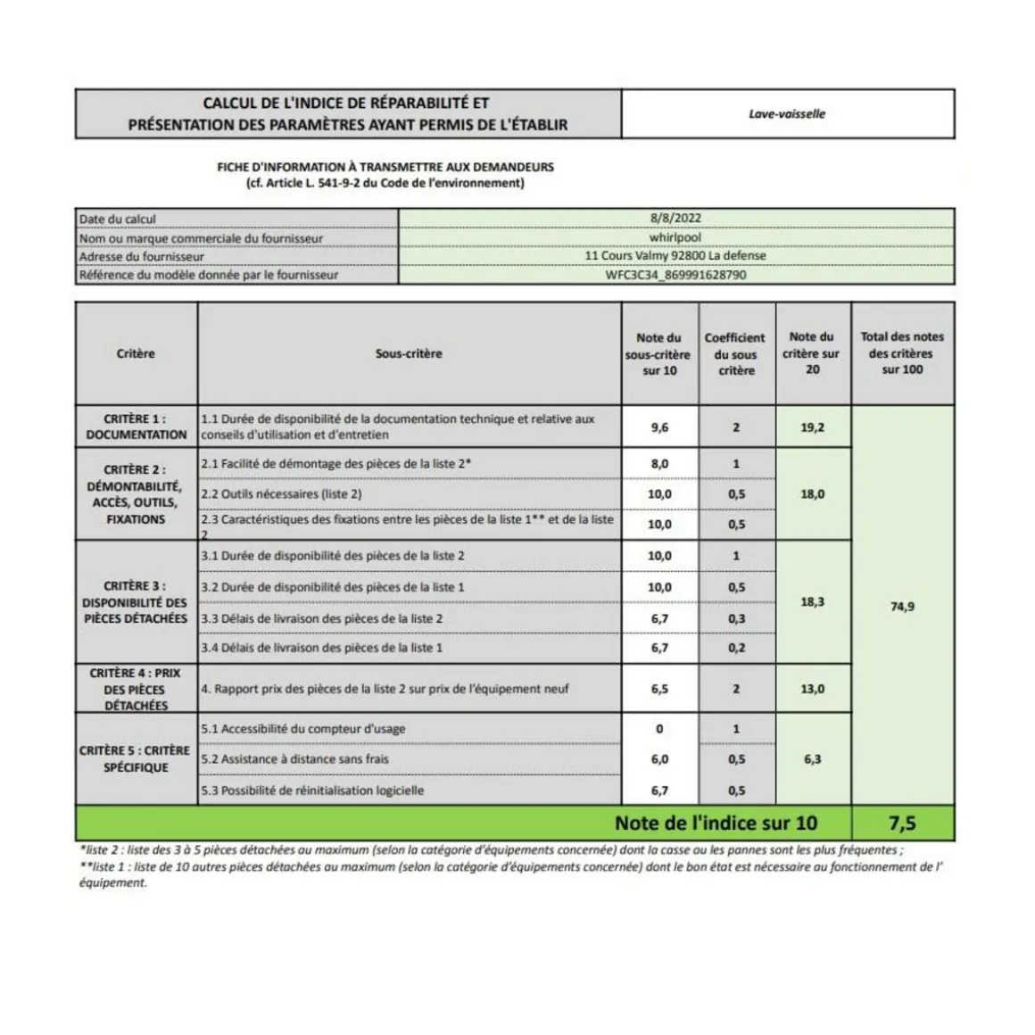 Indice de réparabilité (Note /10) : 7.5.
