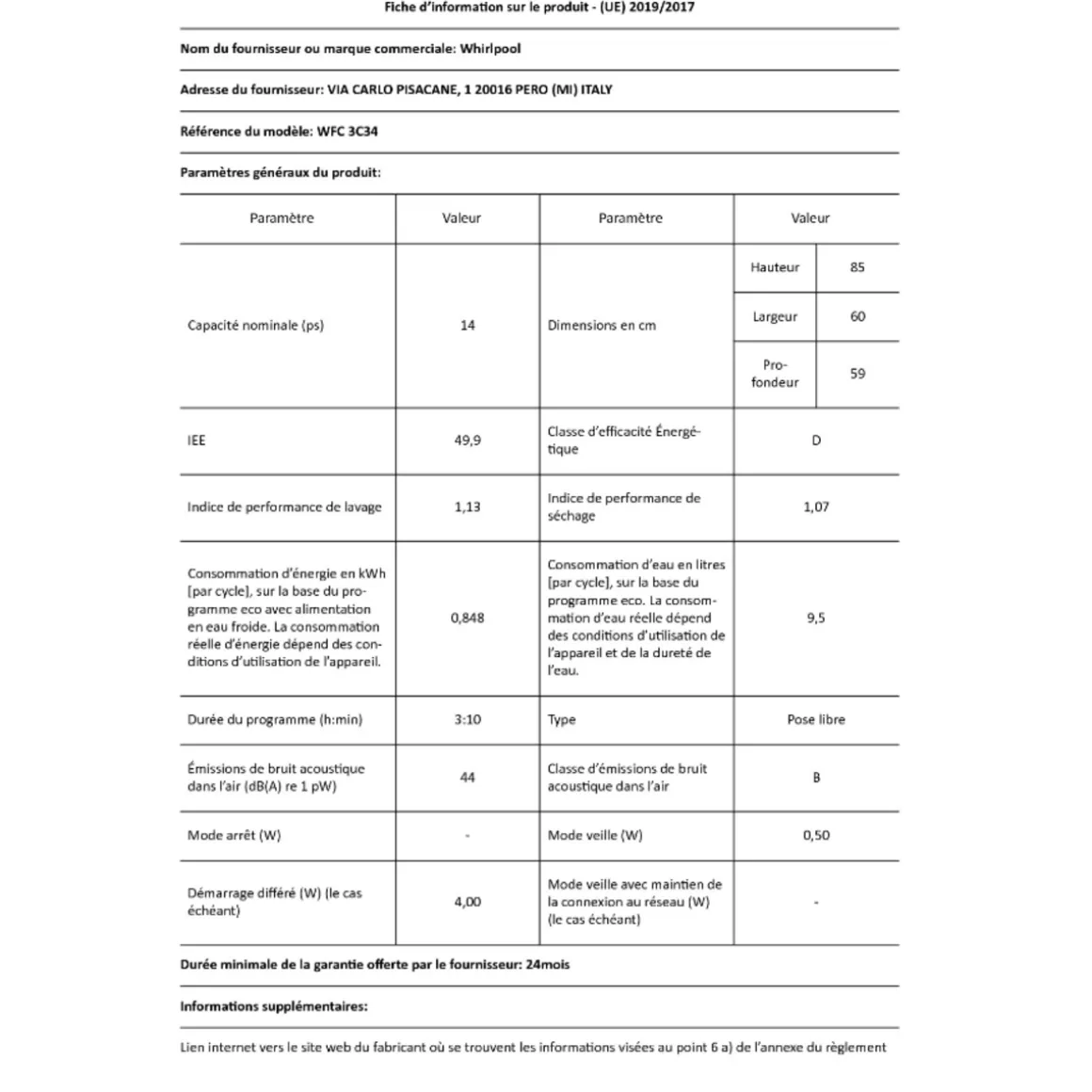 Conso. d’énergie par cycle en programme éco (kWh) : 0.848.