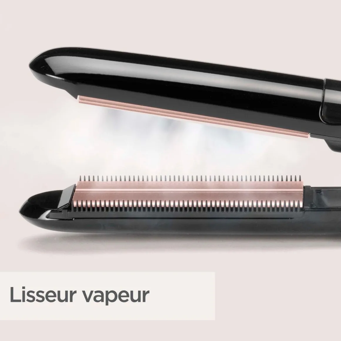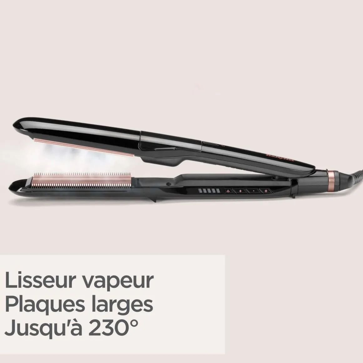 Le lisseur vapeur BABYLISS ST493E en noir vous permet de lisser vos cheveux tout en réduisant les frisottis grâce à sa fonction anti-frisottis. Il propose 5 niveaux de température allant de 150 à 230 °C pour convenir à tous les types de cheveux. Avec ses plaques flottantes de 39 x 100 mm, il est prêt en seulement 30 secondes et s’arrête automatiquement pour plus de sécurité. Il dispose également d’un réservoir de 12 ml pour la fonction vapeur.