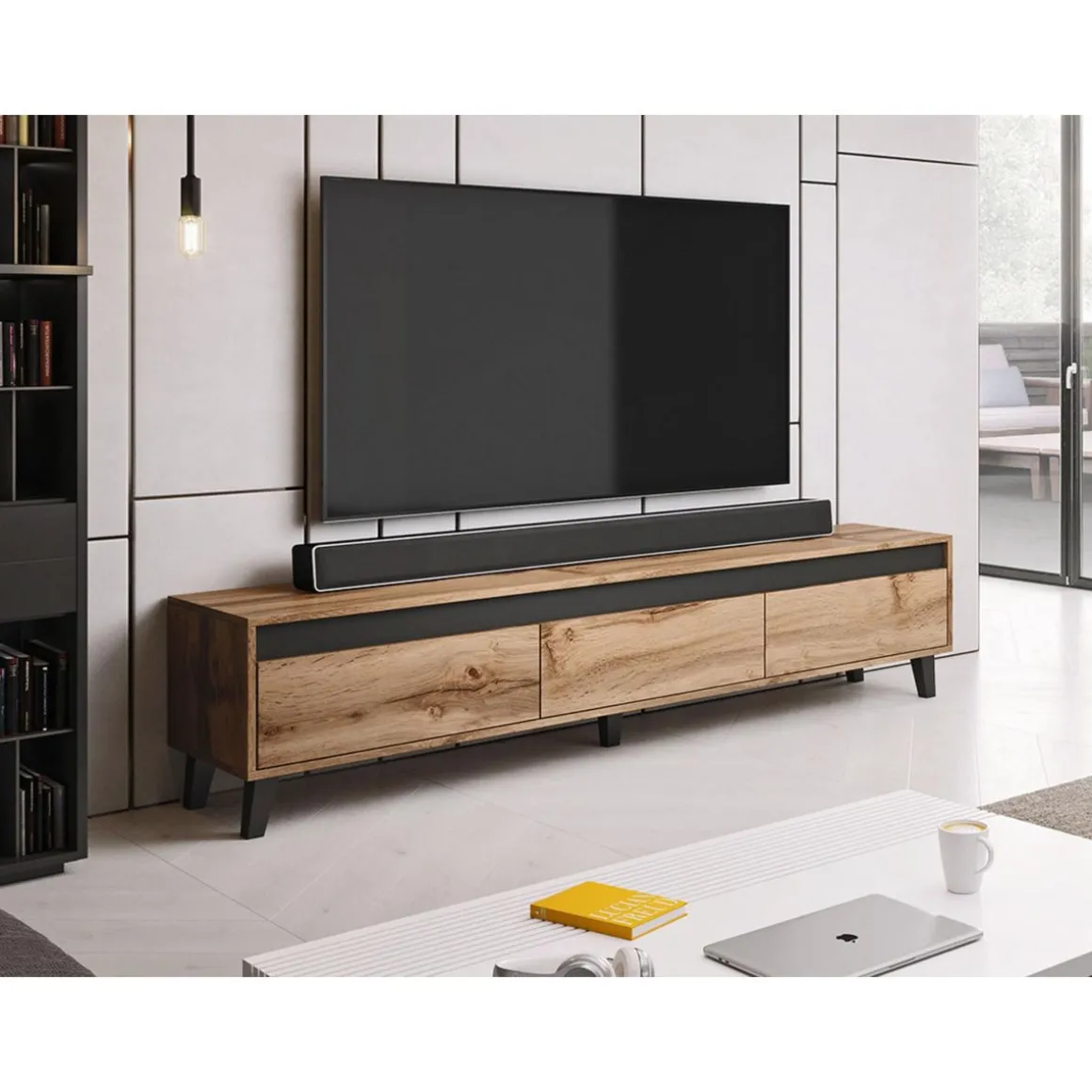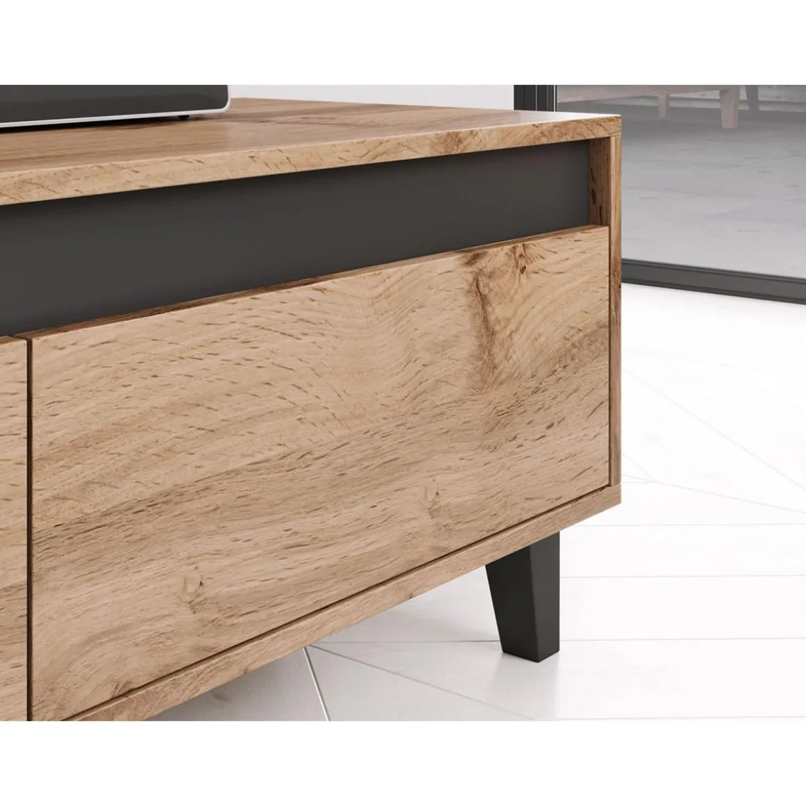 Le meuble TV Lord présente un style particulier notamment grâce à la bande sombre uniforme située juste au-dessus des tiroirs. Par ailleurs, les pieds des meubles sont conservés dans un ton cohérent avec la couleur miel du bois.