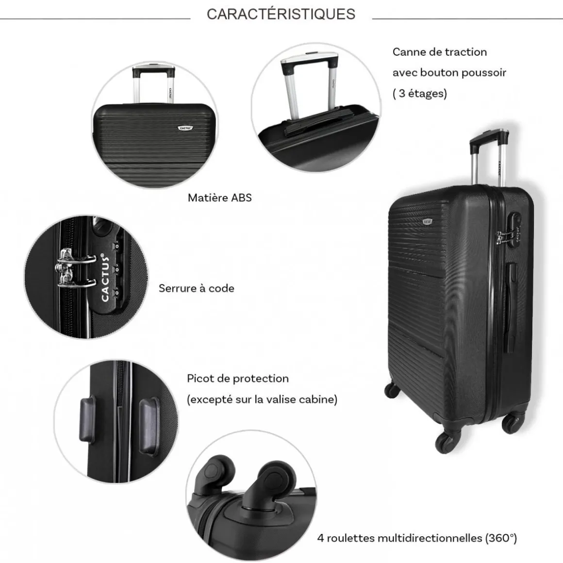 4 picots de protection sur le côté, (excepté sur la valise cabine)