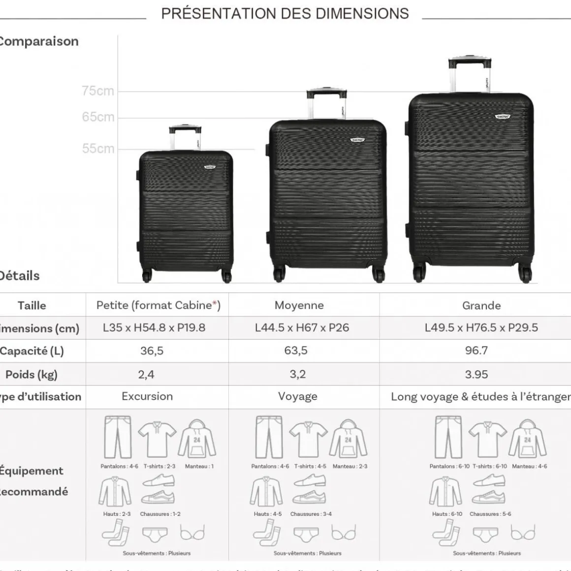 Les dimensions indiquées sont les dimensions extérieures des bagages, comprenant poignées, roulettes, pieds, poches latérales et autres éléments extérieurs.