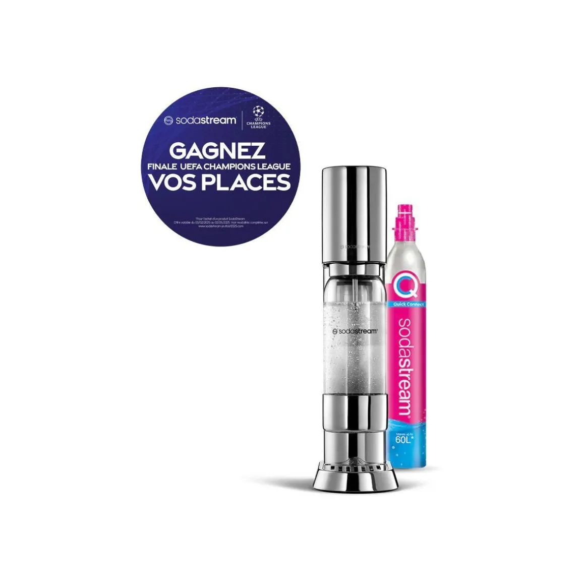 | Livré avec | – Bouteille 1L sans BPA compatible lave-vaisselle – Recharge de gaz 60L Quick Connect à clipser permettant de réaliser jusqu’à environ 60L d’eau pétillante | |