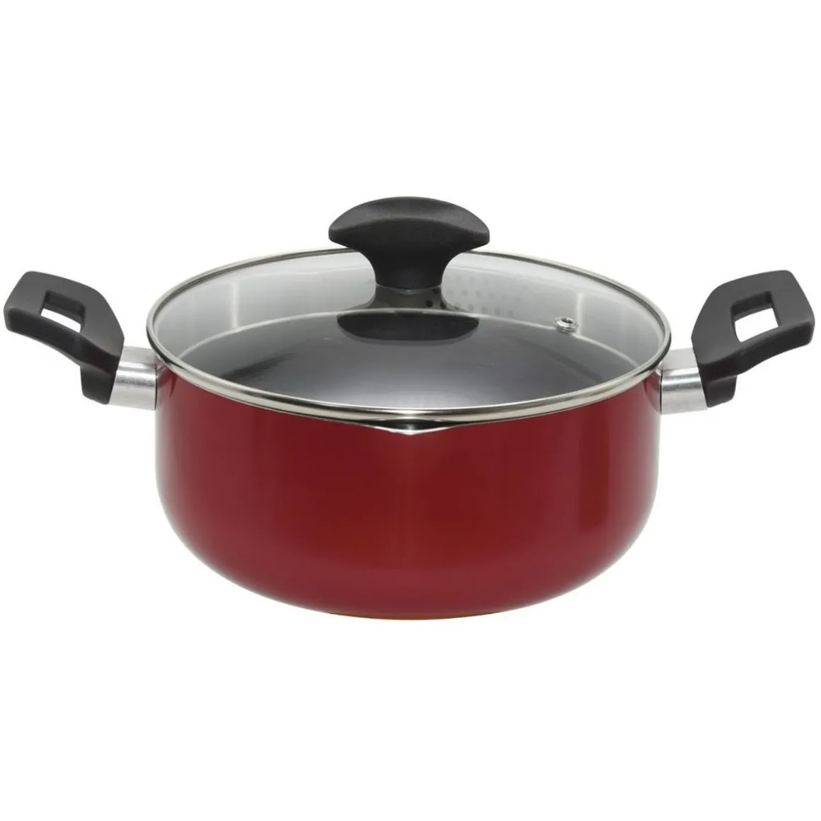 Marmite en aluminium rouge de 30 cm, compatible avec tous feux sauf induction. Revêtement antiadhésif, couvercle rentrant, poignée fixe.