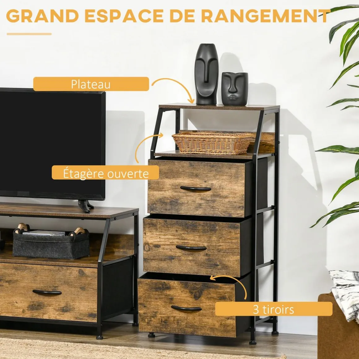 – 5 espaces de rangement disponibles : 3 tiroirs, niche, étagère