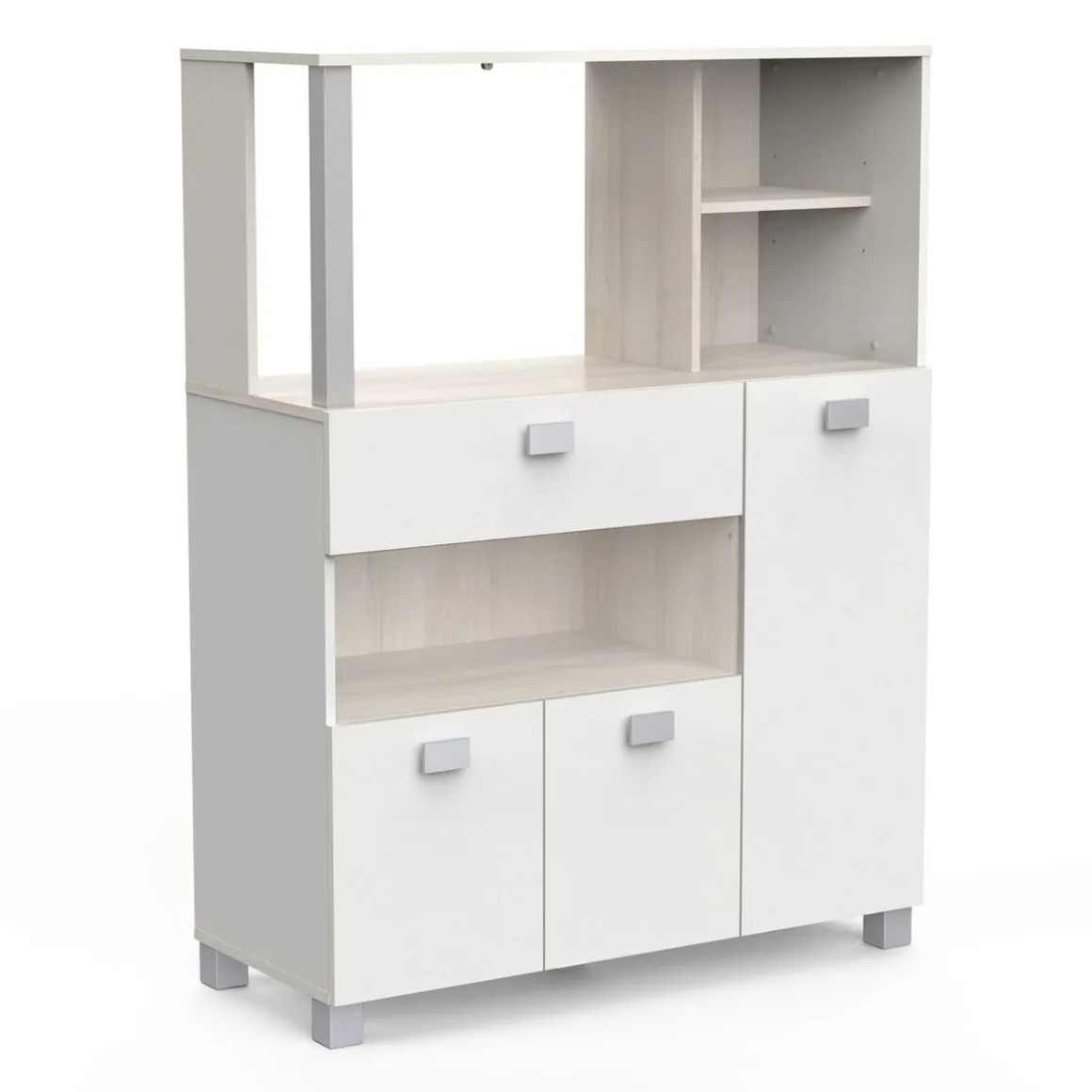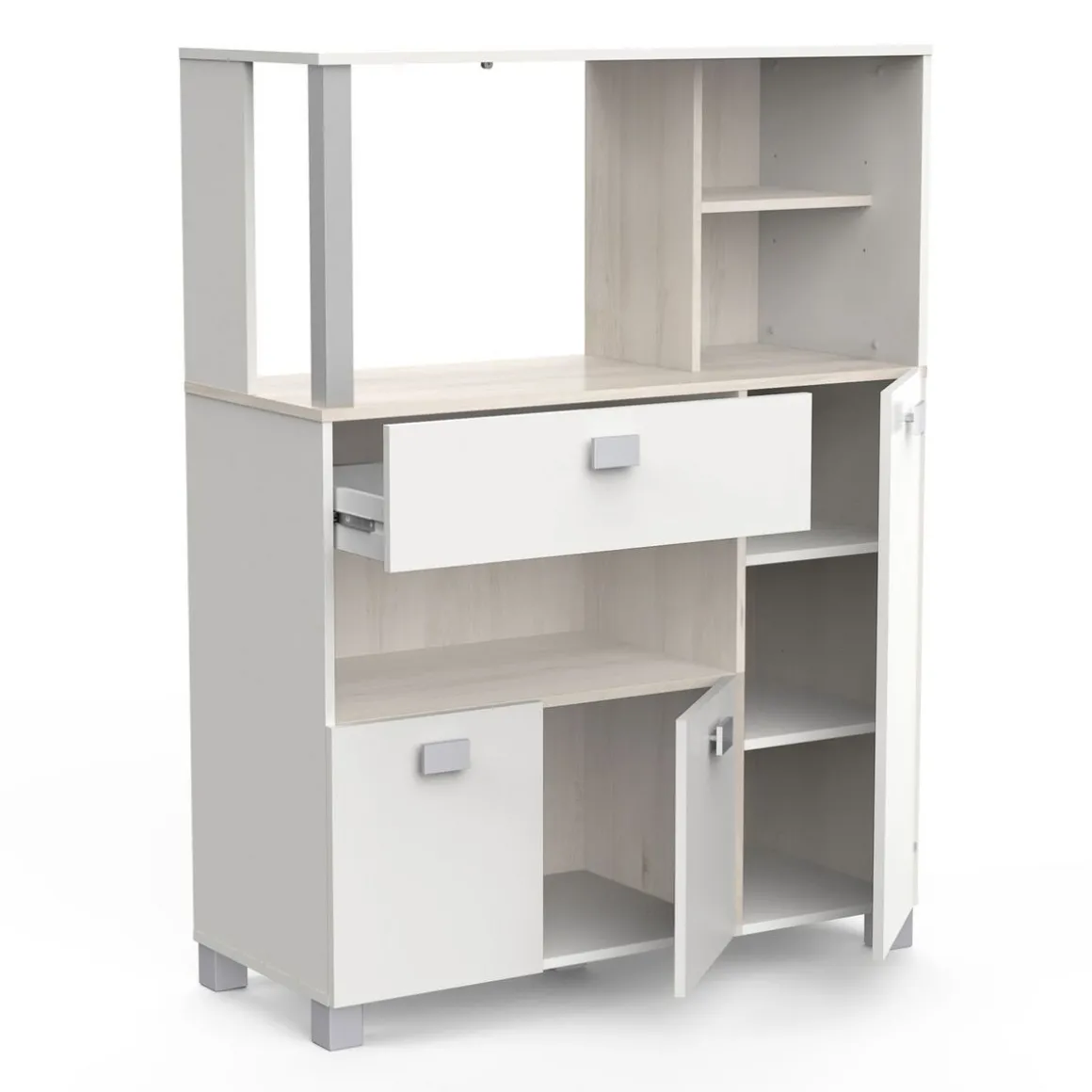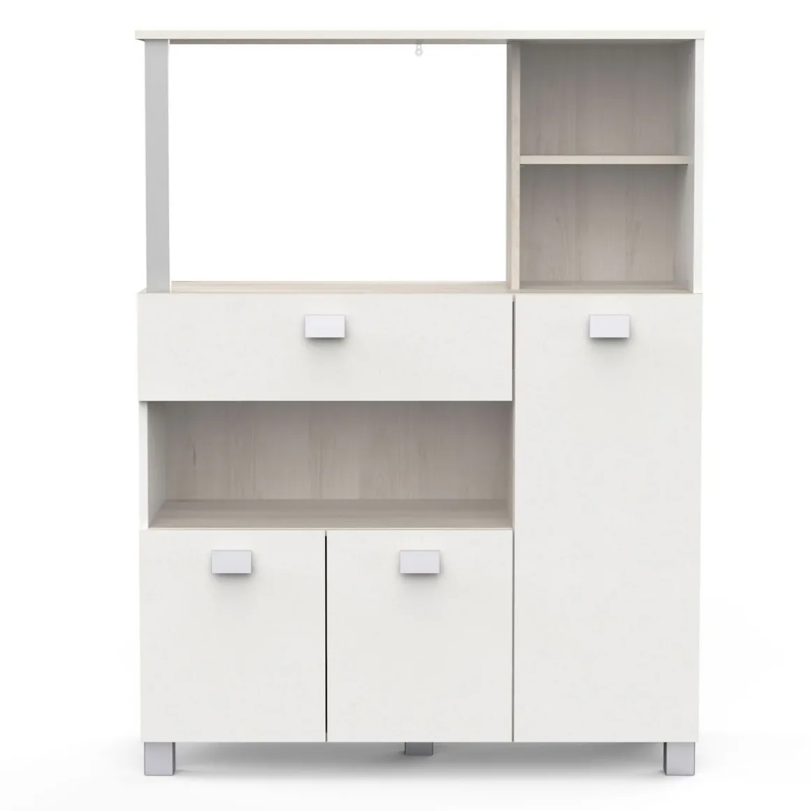 Large capacité de rangement : 4 niches ouvertes dont une micro onde, 1 tiroir, 3 portes, 4 rayons dont 3 ajustables sur 3 niveaux, 1 grande tablette supérieure pour plus de stockage