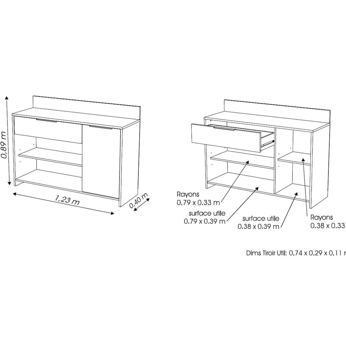 -1 grand tiroir monté sur coulisses métal, dimensions utiles: 74x11x29cm. 1 porte 1 rayon (33x38cm)