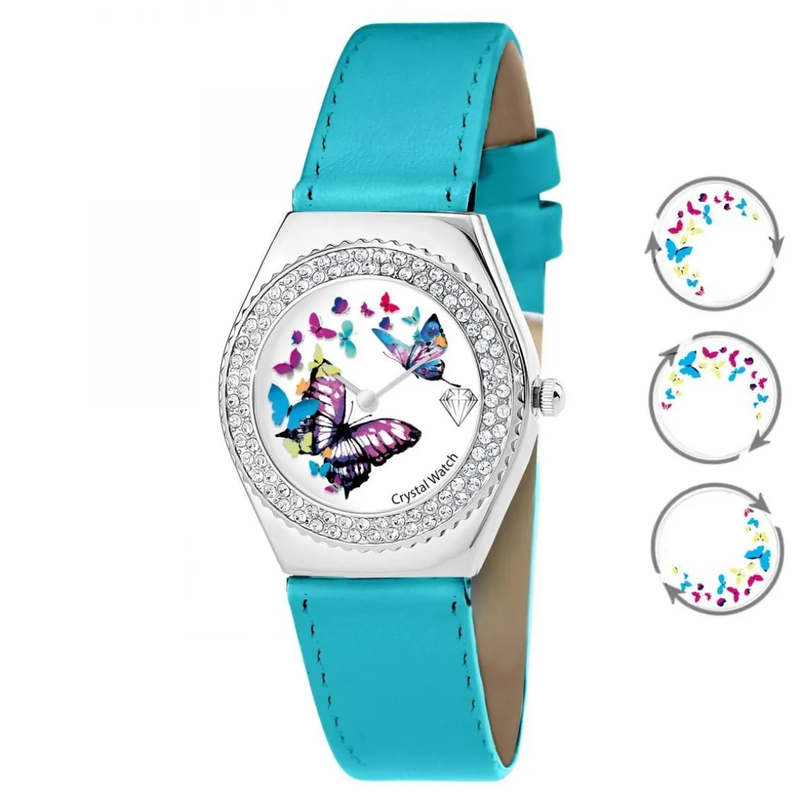 Avec un design audacieux et un éclat fabuleux, la montre Alysson papillon à mouvement tournant est une merveilleuse création qui vous confère une allure de pure élégance. Magnifiée d’un cadran orné en dents de scie merveilleusement expressif, un boîtier en acier inoxydable, un bracelet en cuir bleu en forme de papillons multicolores tournant autour du cadran complètent ce design unique. Magnifiquement modelé, ce design ultra féminisé est agrémenté d’une lunette recouverte d’un micro-pavé de 87 Cristaux scintillants brillants et d’un mouvement Quartz haute fiabilité.