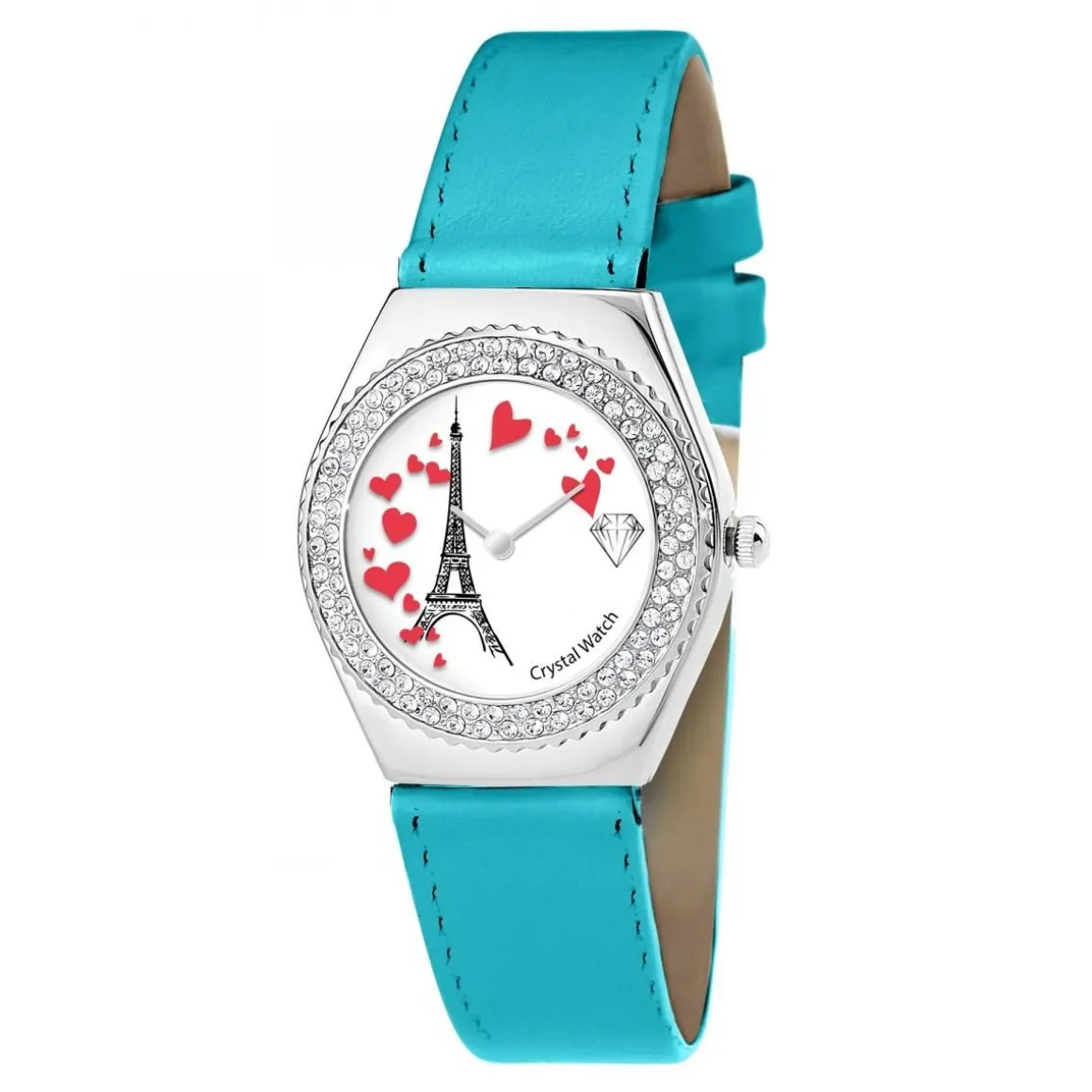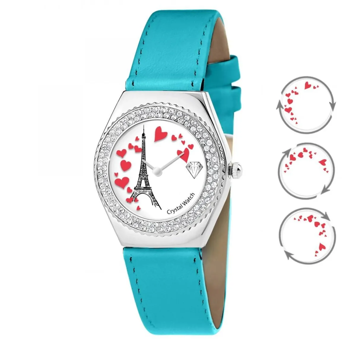 Rehaussez l’éclat de votre brillance avec cette audacieuse et élégante montre Alysson Tour Eiffel à mouvement tournant conceptualisée autour d’un style minimaliste. Adoptez une allure étincelante avec cette montre extraordinaire dont la lunette est recouverte d’un micro-pavé de 87 Cristaux scintillants brillants. Un cadran orné en dents de scie merveilleusement expressif, un boîtier en acier inoxydable, un bracelet en cuir bleu et un mouvement des secondes en forme de cœur tournant autour du cadran complètent ce design unique. Irradiant un éclat Crystal Watch signature, elle est idéale pour offrir.