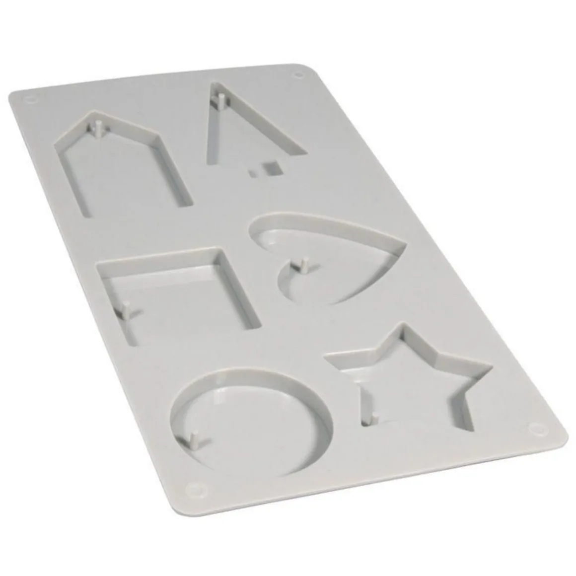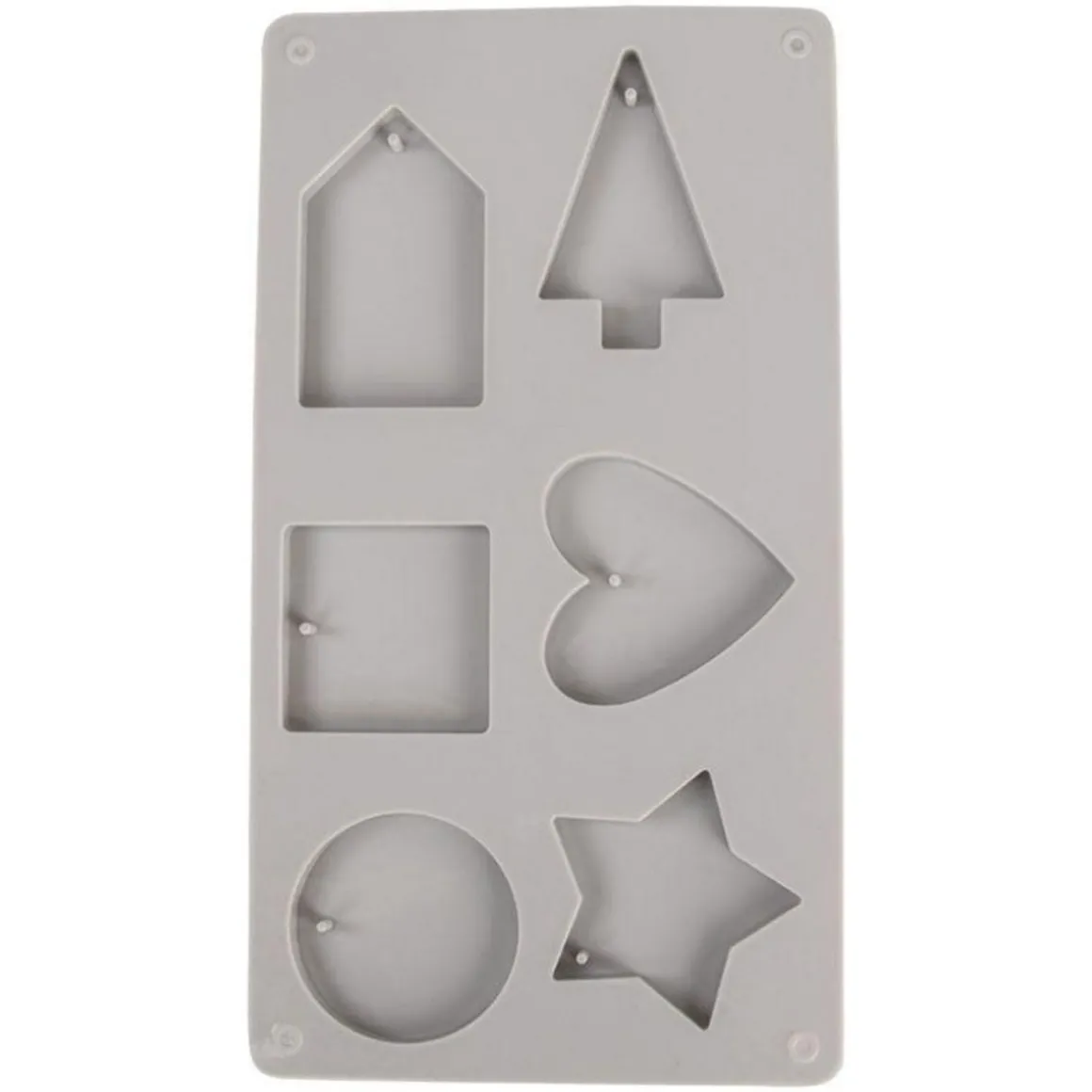 Moule en silicone 6 formes décoratives Rayher. En silicone de hauté qualité, particulièrement résistant au gel et à la chaleur (-40 à +230°C), ce moule est très facile à démouler, indéformable et réutilisable. Il peut être utilisé pour savon, bougie, résine, plâtre, argile. Les formes simples sont les suivantes : maison, sapin,carré, coeur, rond, étoile à 5 branches. Chaque empreinte comprend une pique en relief pour obtenir un trou dans la forme moulée. Ainsi vous pouvez la suspendre.