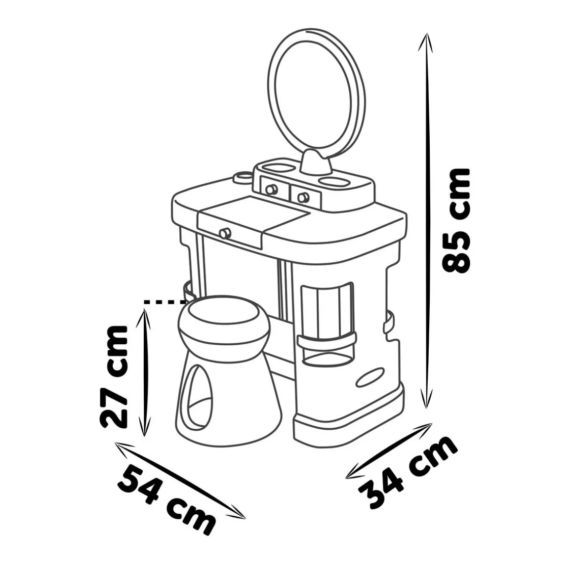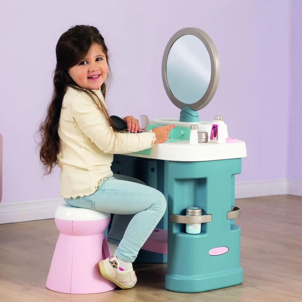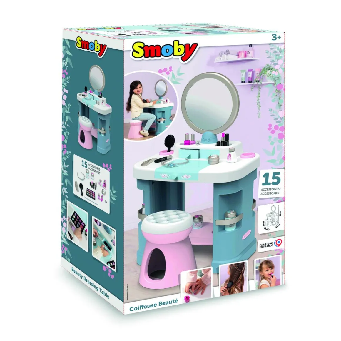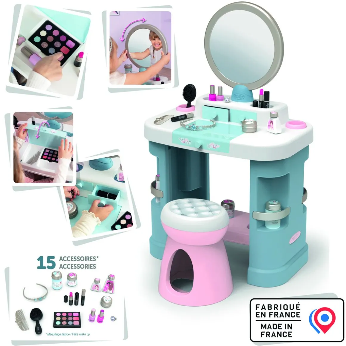 L’article est équipé d’un grand miroir inclinable, de tiroirs, de pots de rangement et d’une trappe pour organiser les accessoires.