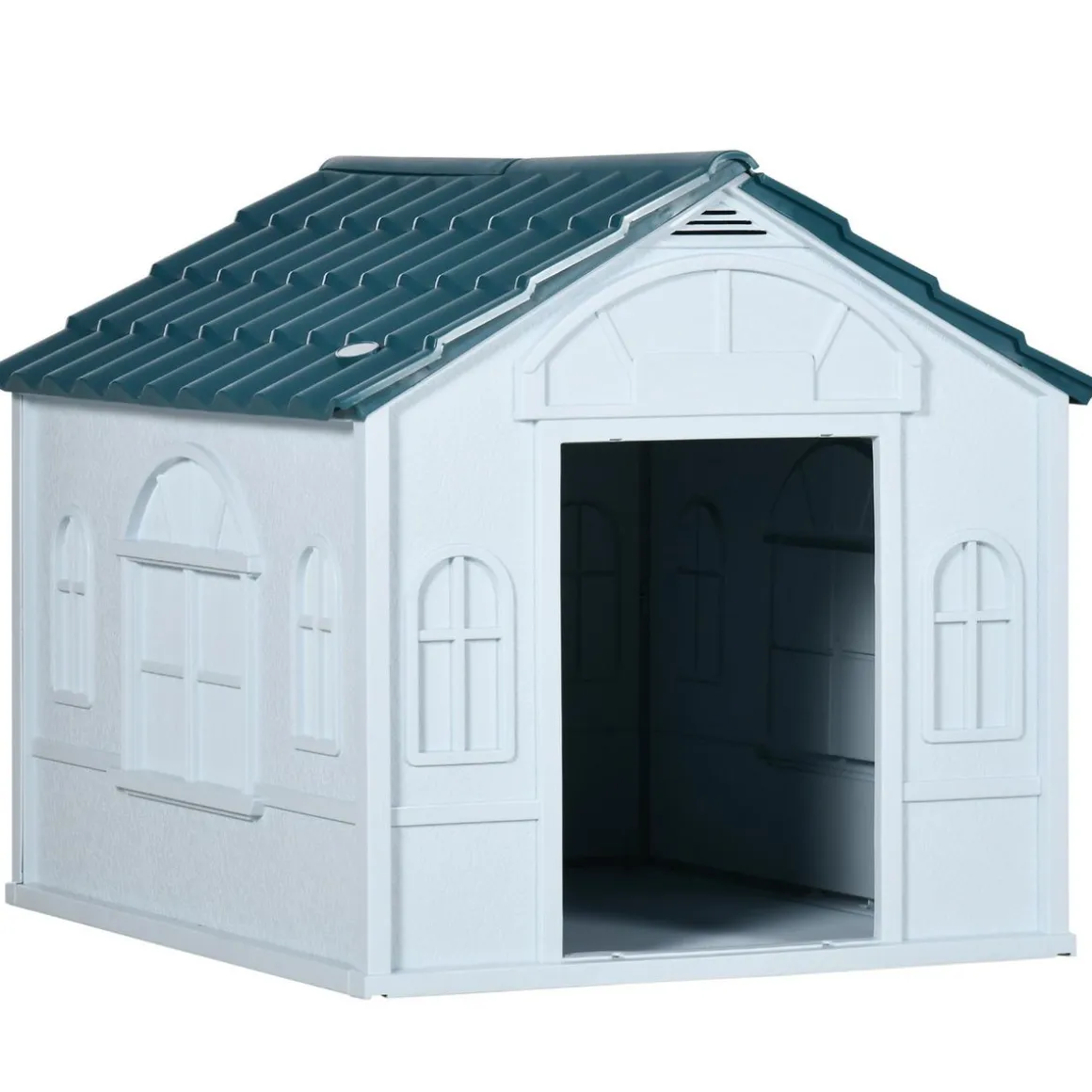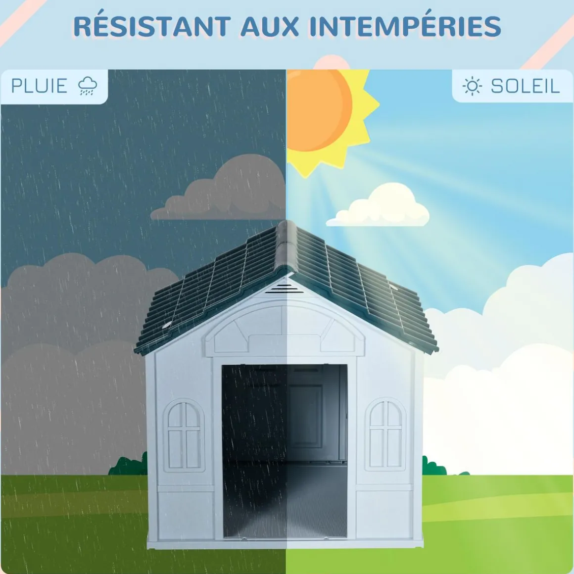 – Niche chien cottage mêlant originalité et élégance : toit double pente imitation tuiles noires et fenêtres