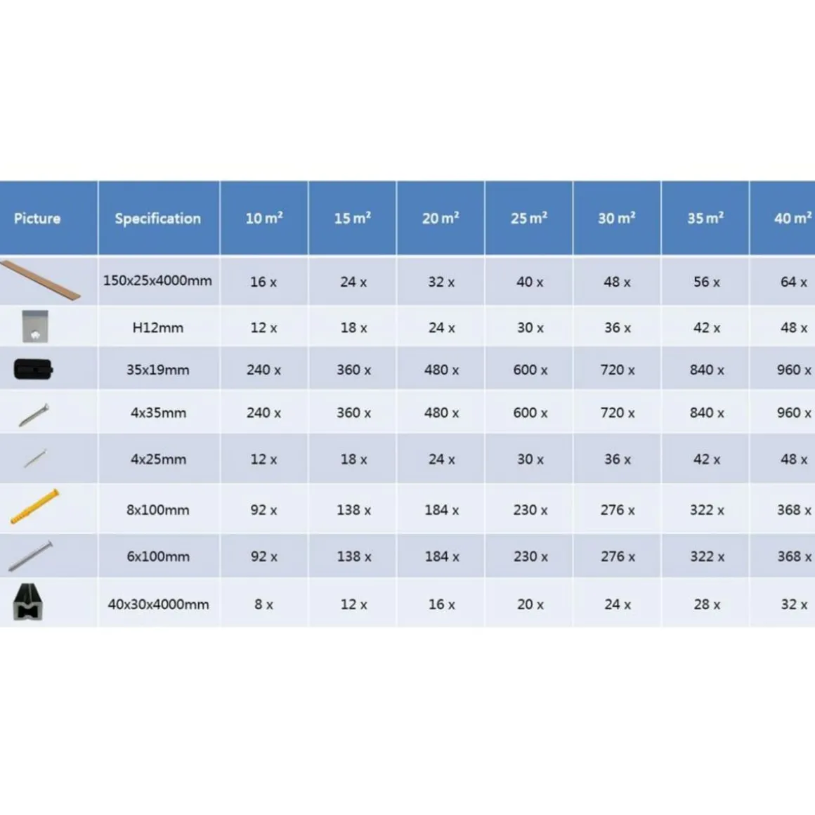 Fabriques en composite bois-plastique de qualite, nos panneaux de terrasse sont resistants a l’eau et tres durables. Les panneaux de terrasse ont une epaisseur de 25 mm, ce qui les rend tres resistants. De plus, ces panneaux de terrasse ont un motif different de chaque cote. La livraison inclut 40 panneaux de terrasse, 20 quilles, 600 pinces en plastique, 630 vis en acier inoxydable, 230 vis d’extension en plastique et 30 pinces de depart en acier inoxydable. Cet ensemble est facile a assembler.