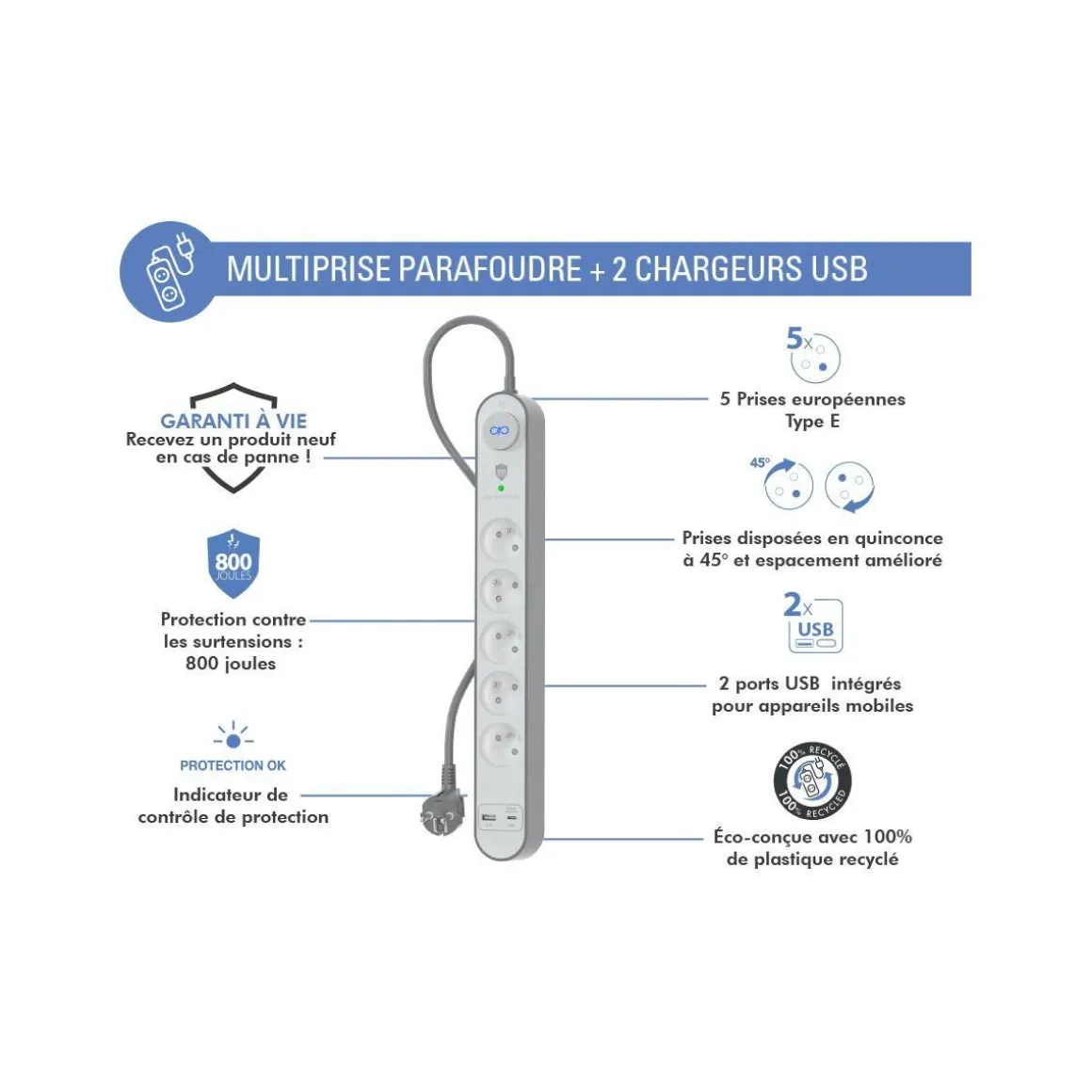 Parafoudre Lite 5 prises + USB A+C 800J 1.5m EU