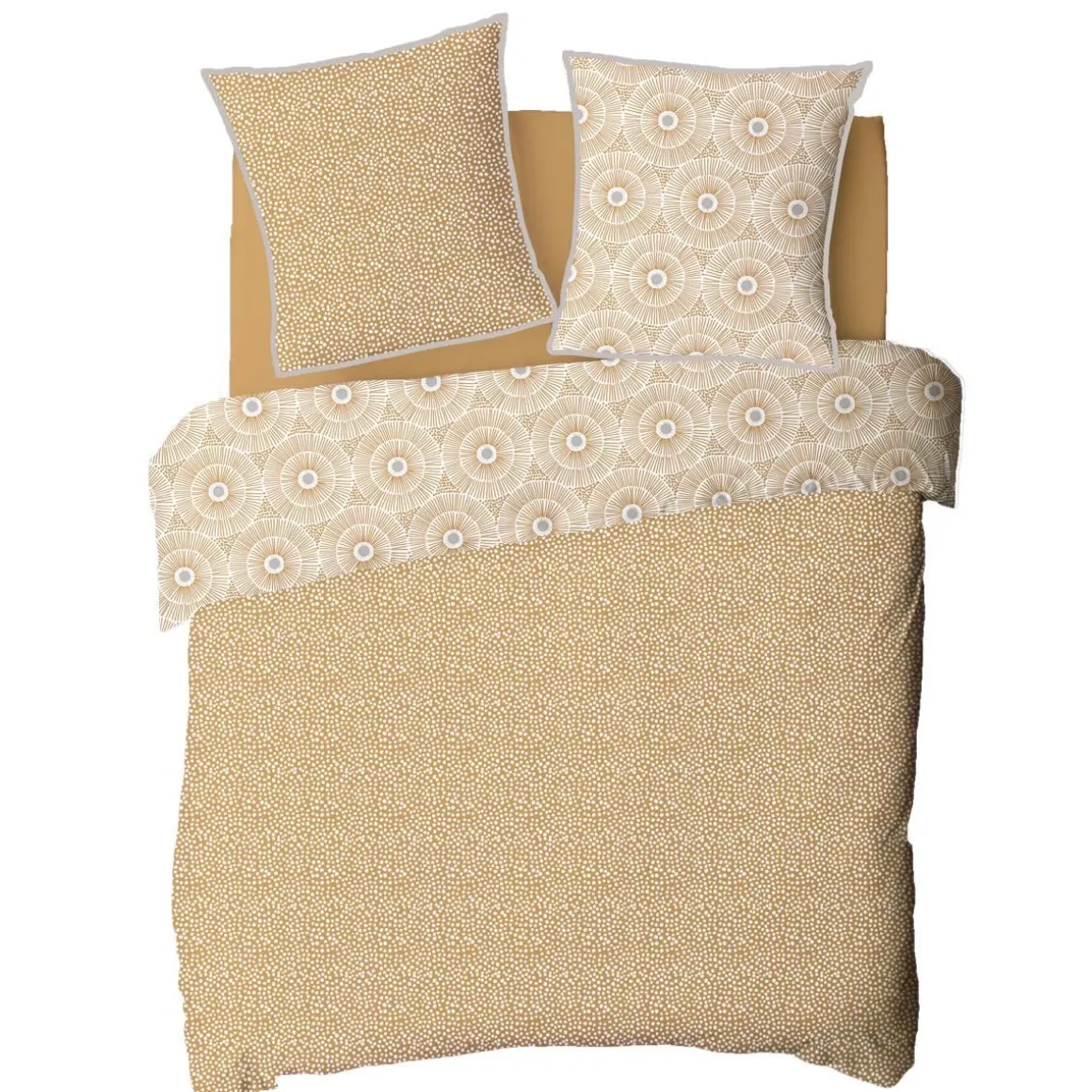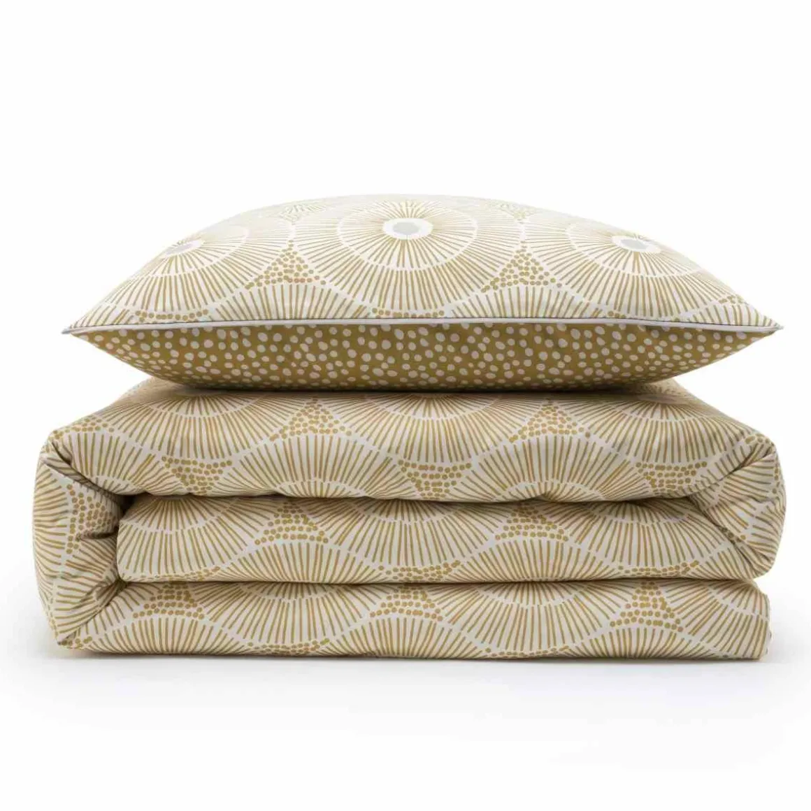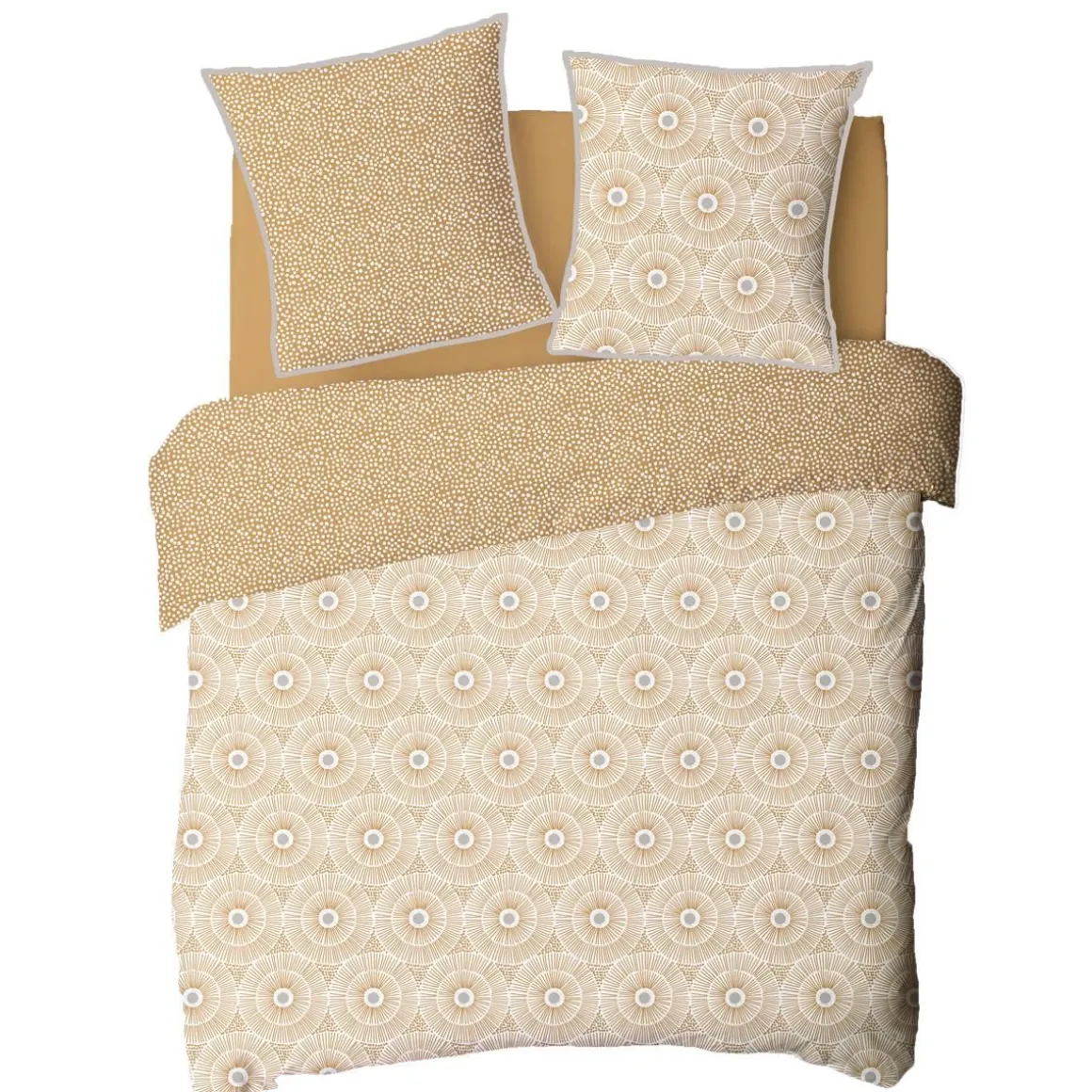 Parure de lit en coton réversible imprimé graphique 57 fils beige comprenant 1 housse de couette + 2 taies d’oreiller 63x63cm.
