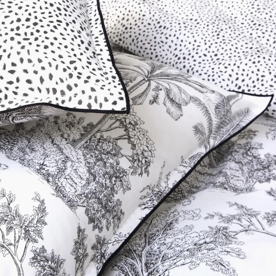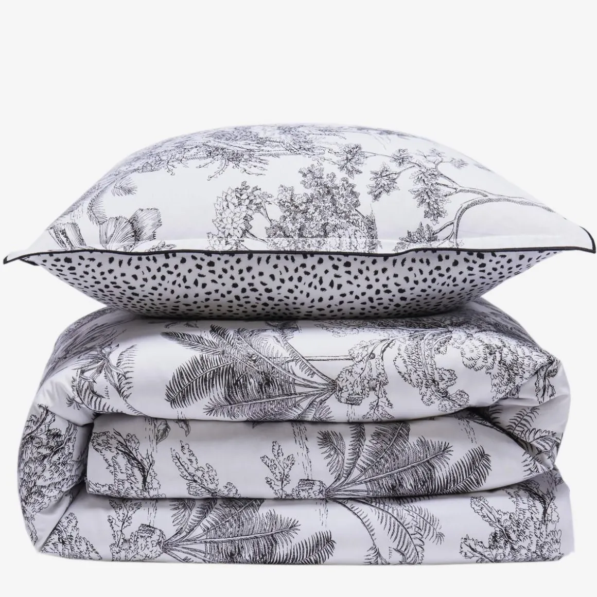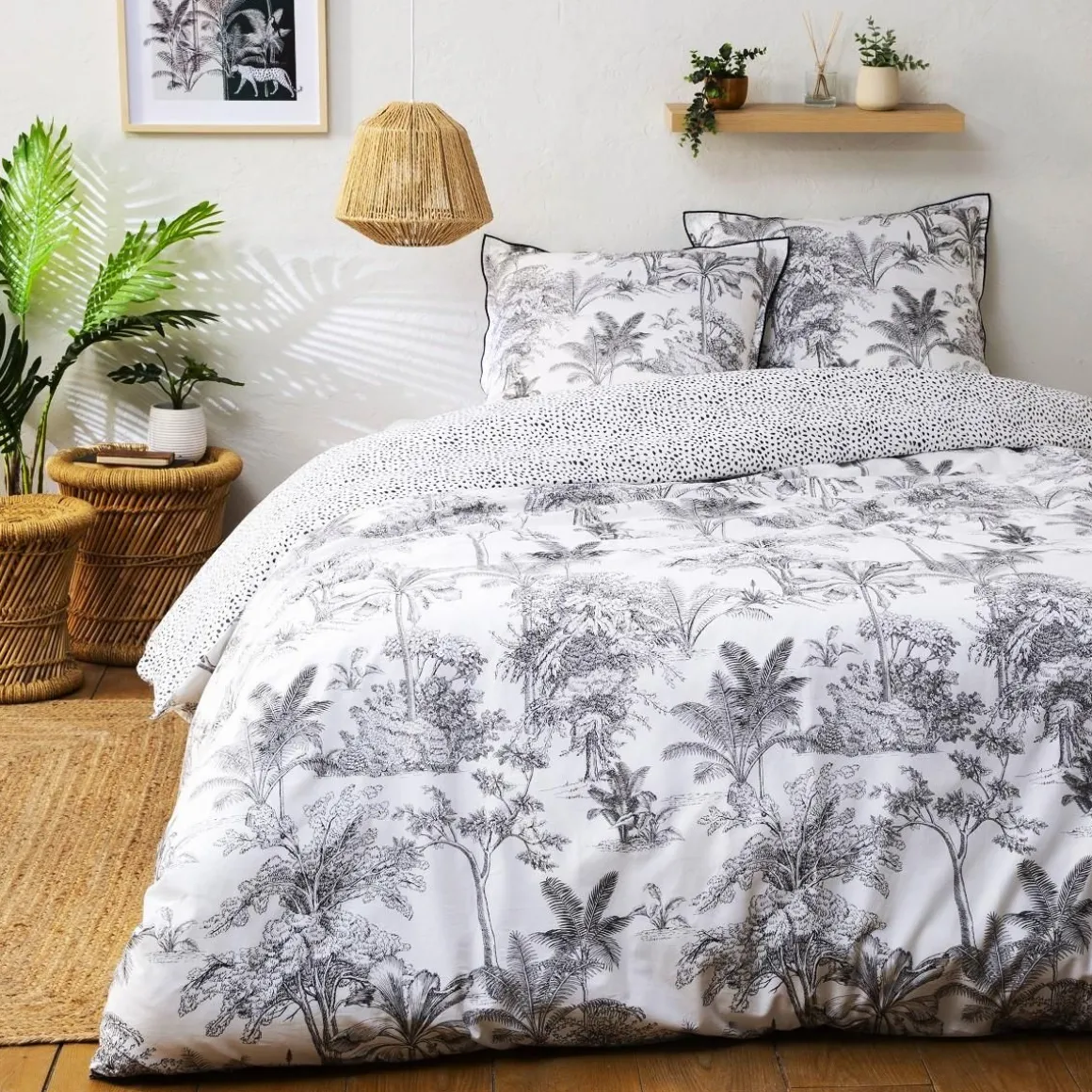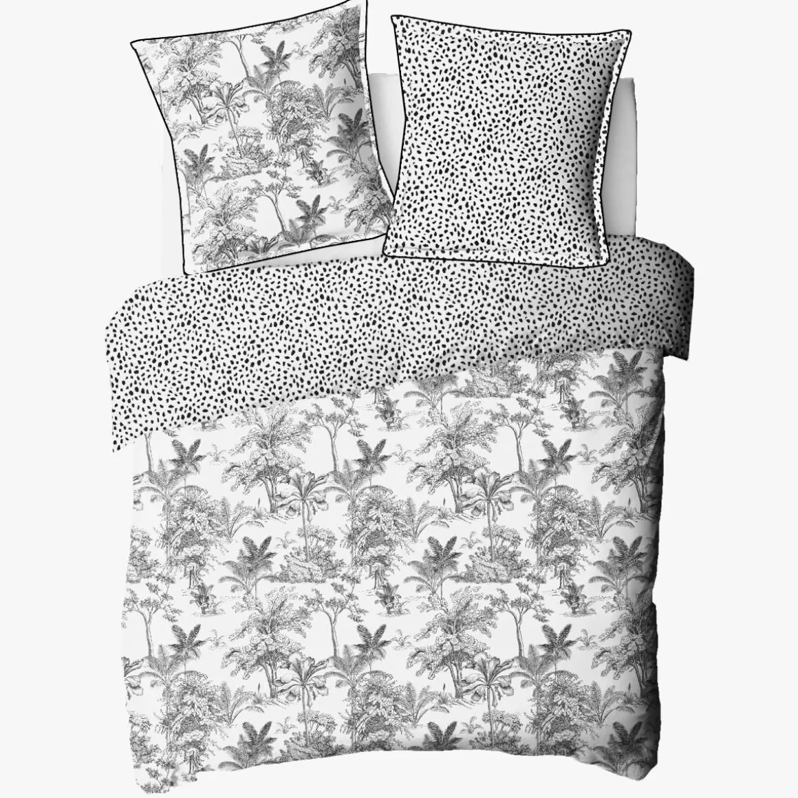 Parure de lit en coton réversible imprimé jungle 57 fils blanc comprenant 1 housse de couette + 2 taies d’oreiller 63x63cm.